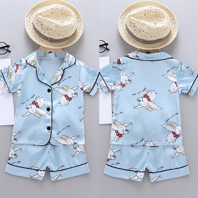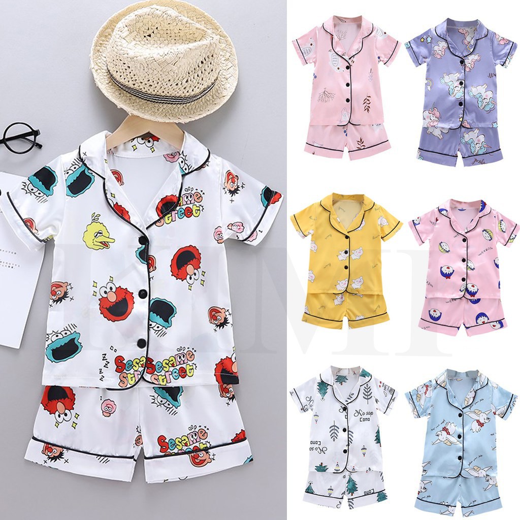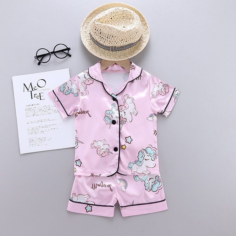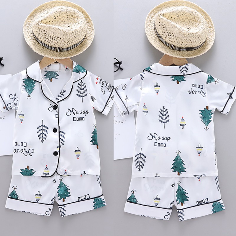 Baby Sleepwear Cartoon Print Kids Pajama Set Girls Boys Short Sleeve Sleep Blouse+Shorts 2Pcs Sets Silk Pajamas Nightclothes For 1-6 Years Old