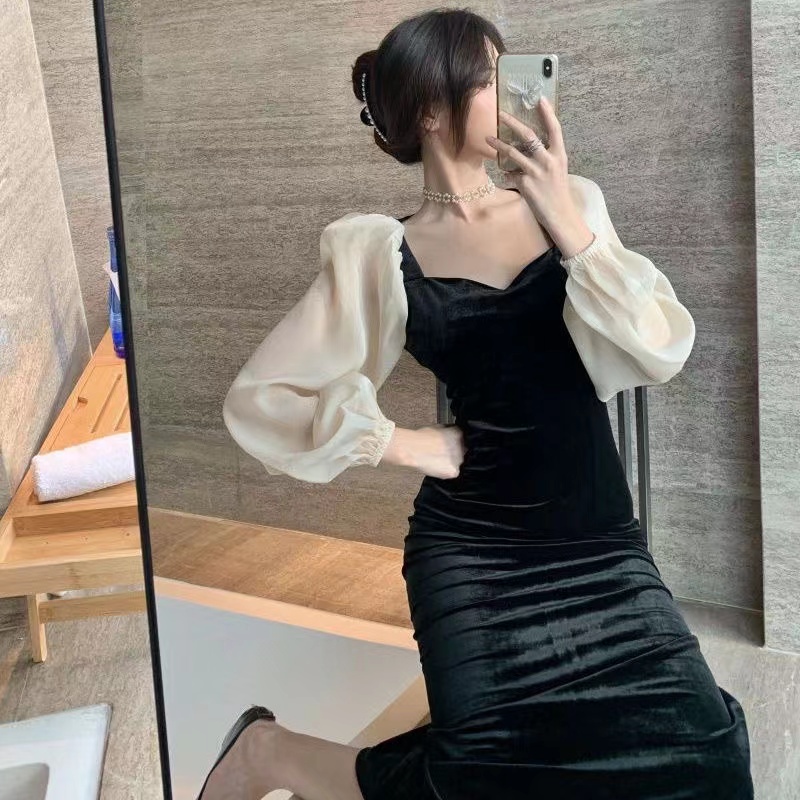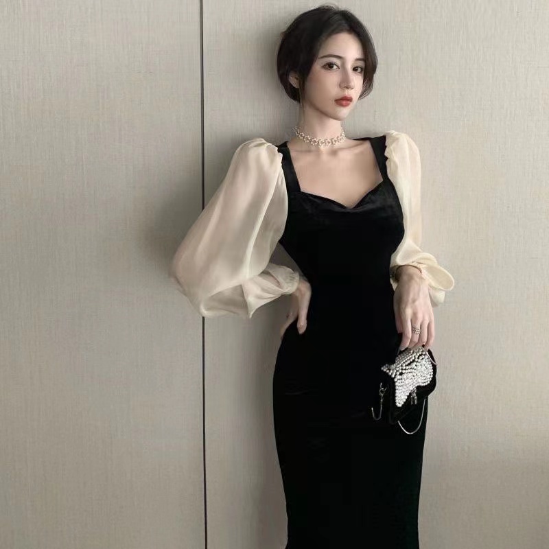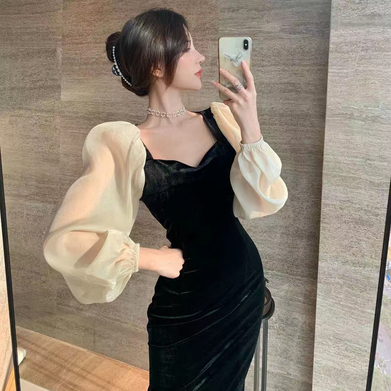 (COD) Ladies Gold Velvet Temperament Dress Female Simple Sweet V-Neck Fashion Long Skirt