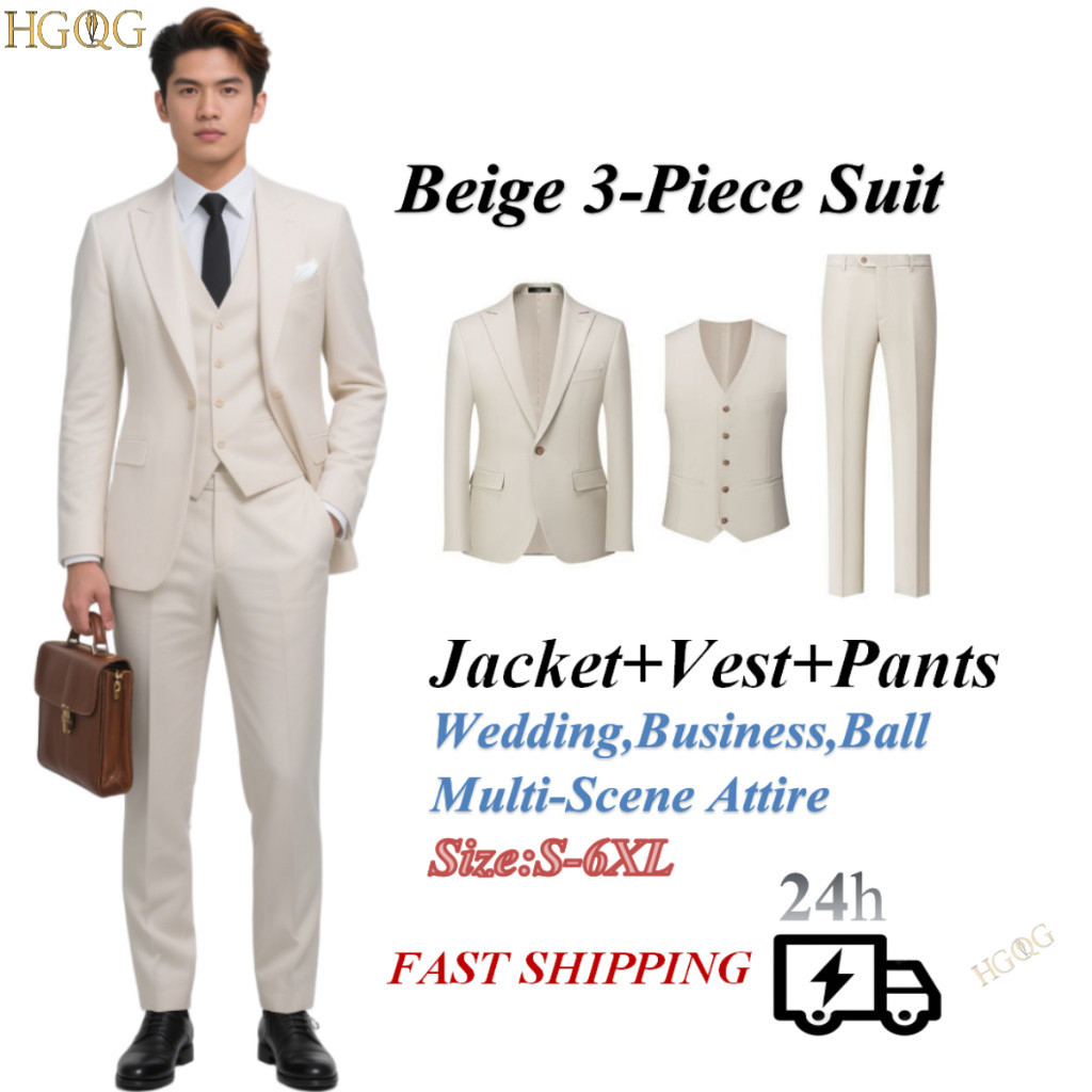 (Local Delive)Beige 3 in 1Business Suits Sets Slim Formal Apricot Grooms Wedding js prom men suits