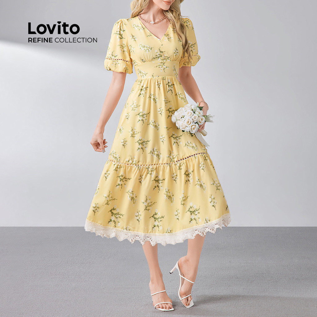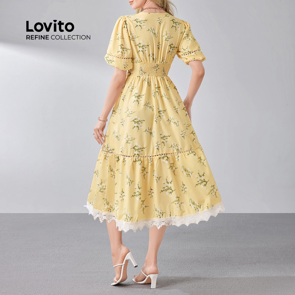 (Lovito Refine) Elegant Dress Floral Print Festival Zipper Ruffle Neck Double Layer Spring/summer Yellow Dress for Women LR13L170