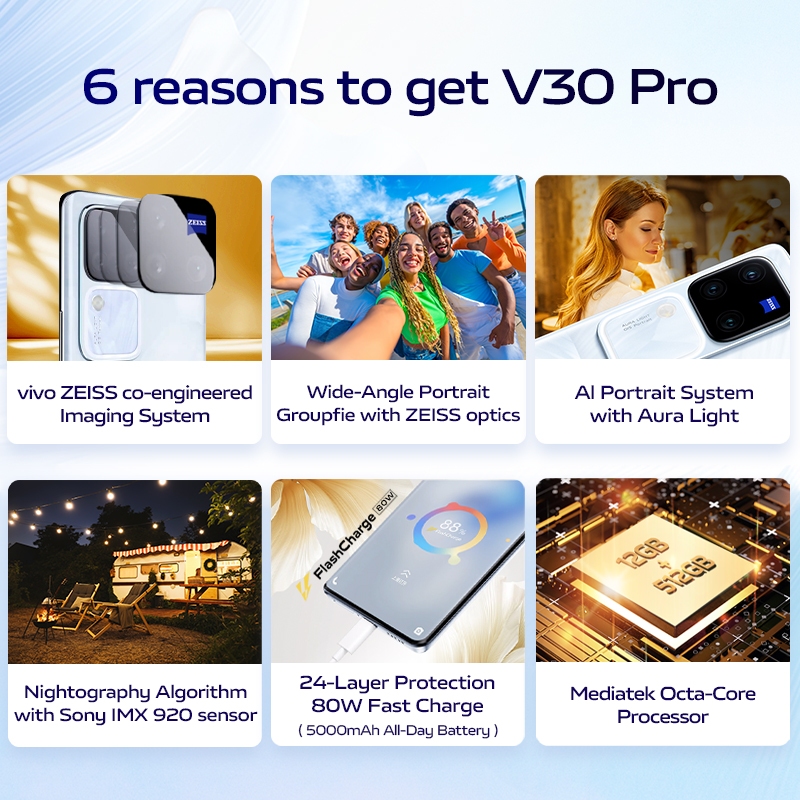 【HOT】 vivo V30 Pro 5g with ZEISS | Sony IMX 816 Sensor | 12+12GB RAM + 512GB ROM | Mediatek 8200