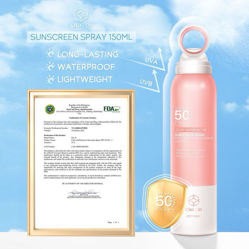 (WITH FREEBIE) Glo21 Sunscreen Spray (150mL) SPF50+ Waterproof UV Protection High Power Sunscreen