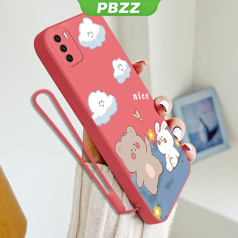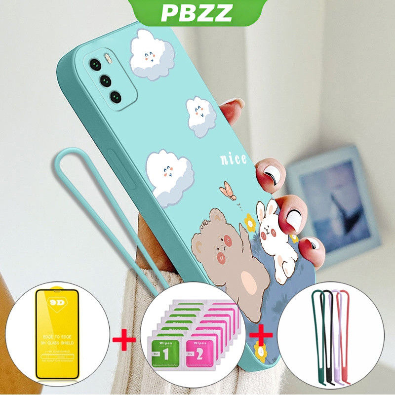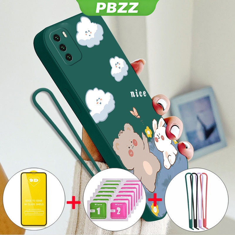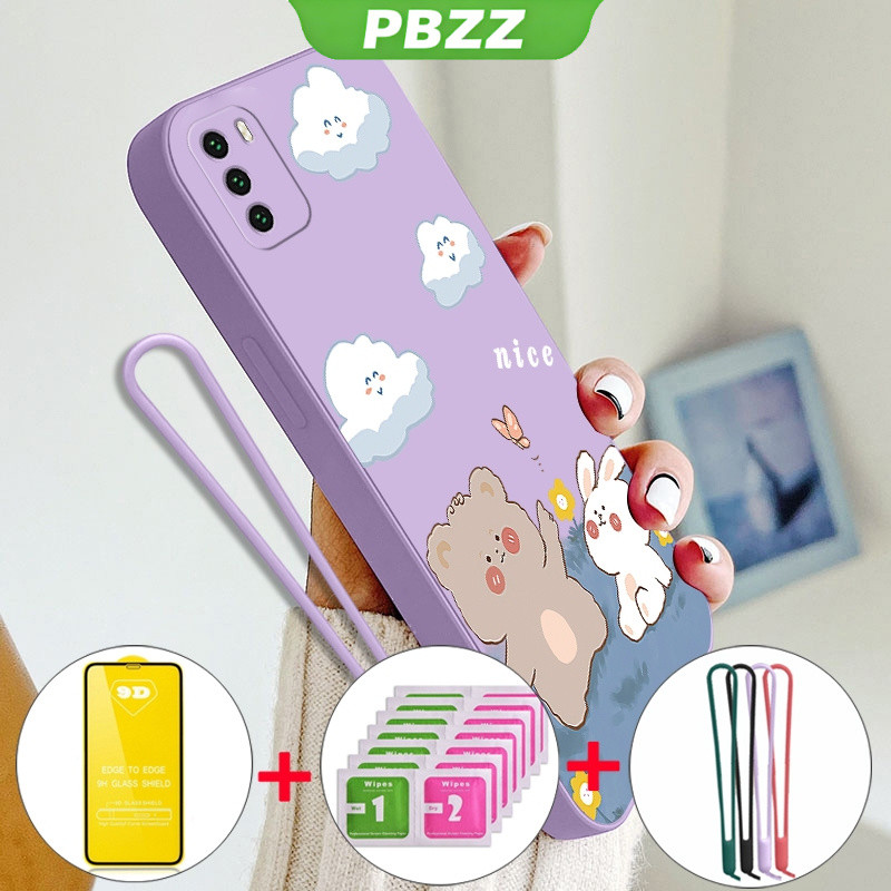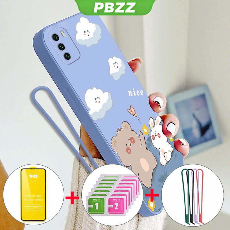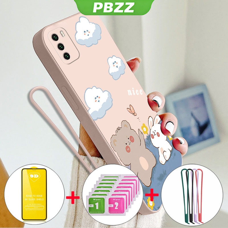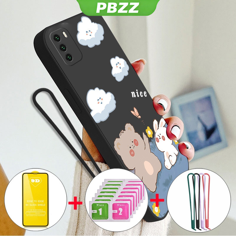 [4 in 1]With Tempered Glass Case for xiaomi poco m3 phone casing Softcase Liquid Silicone shockproof Cover new design aesthetic Cartoon Bear Rabbit YTMXX01