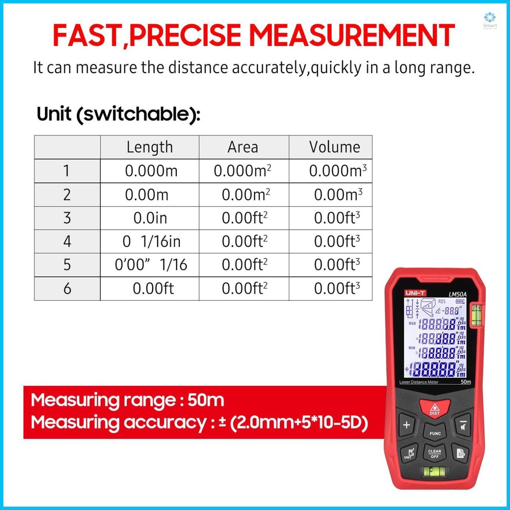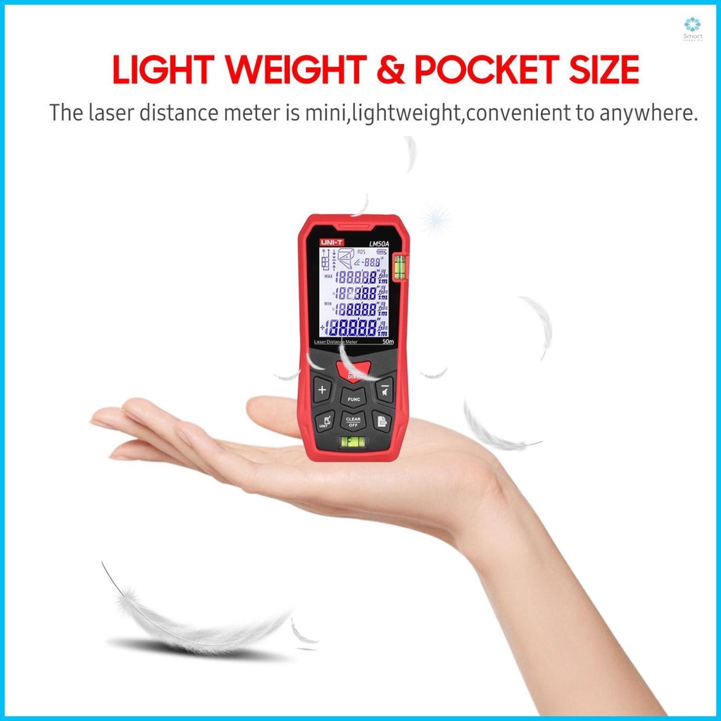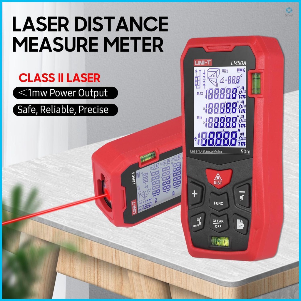 [COD] UNI-T LM50A Laser Distance Measure Meter 50M with 2 Bubble Levels LCD Backlit Display Pythagorean Mode Measure Distance Area Volume Mute Function 99 Groups Data Storage Carrying Bag