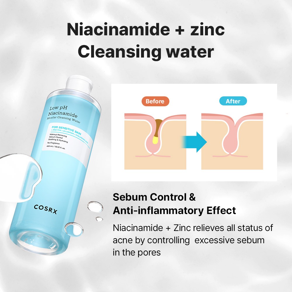 [COSRX OFFICIAL] Low pH Niacinamide Micellar Cleansing Water, for Sensitive Skin, Micellar Technology, Sebum Control, Makeup Remover, Low pH Cleansing