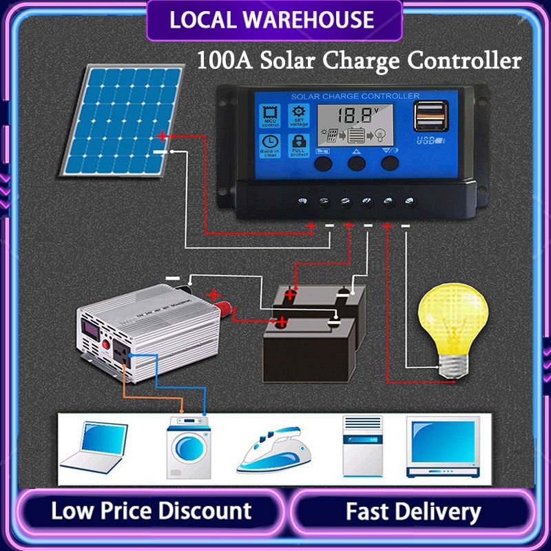 [Fast delivery] 100A Solar Charge Controller, Solar Panel Controller 12V/24V Adjustable LCD Display Solar Panel Battery Regulator with Dual USB Port