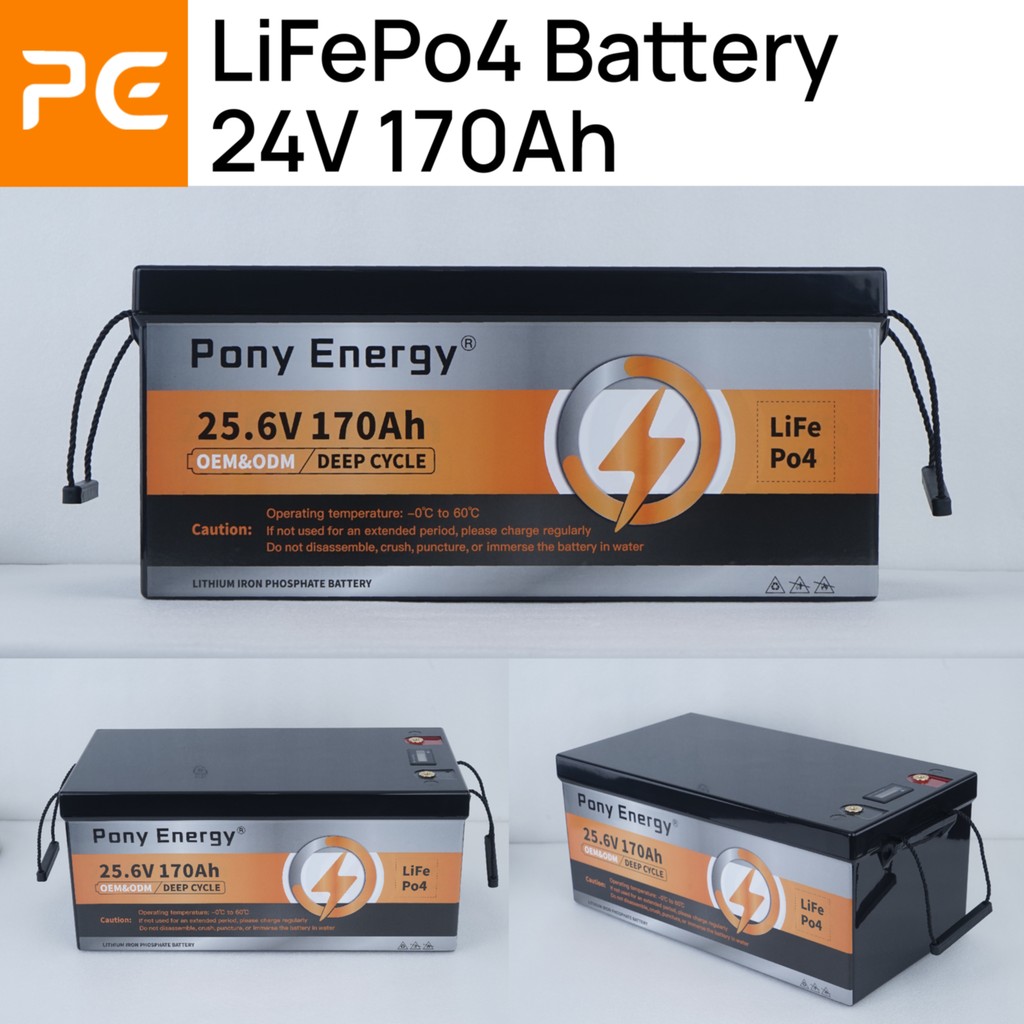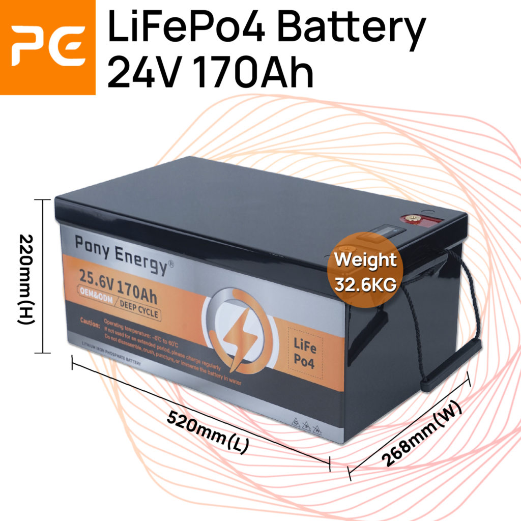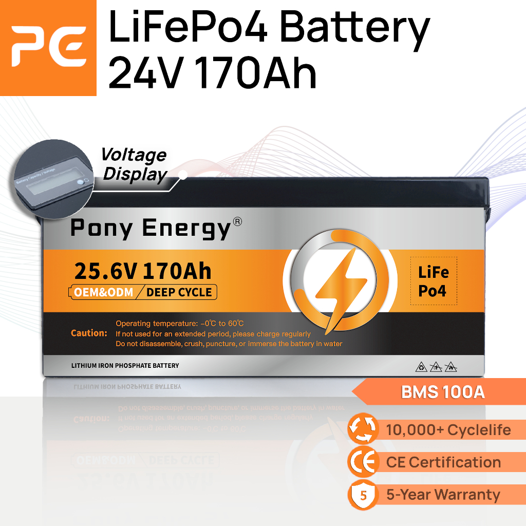 【Free charge】PonyEnergy 24V 170Ah LiFePO4 Battery, 4352Wh, VoltDisplay & BMS(100A), Series-Con