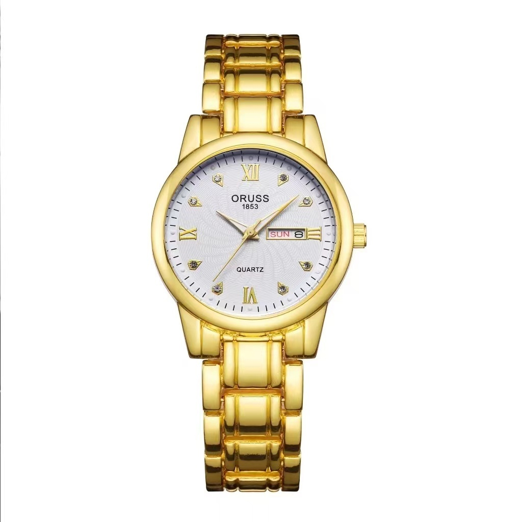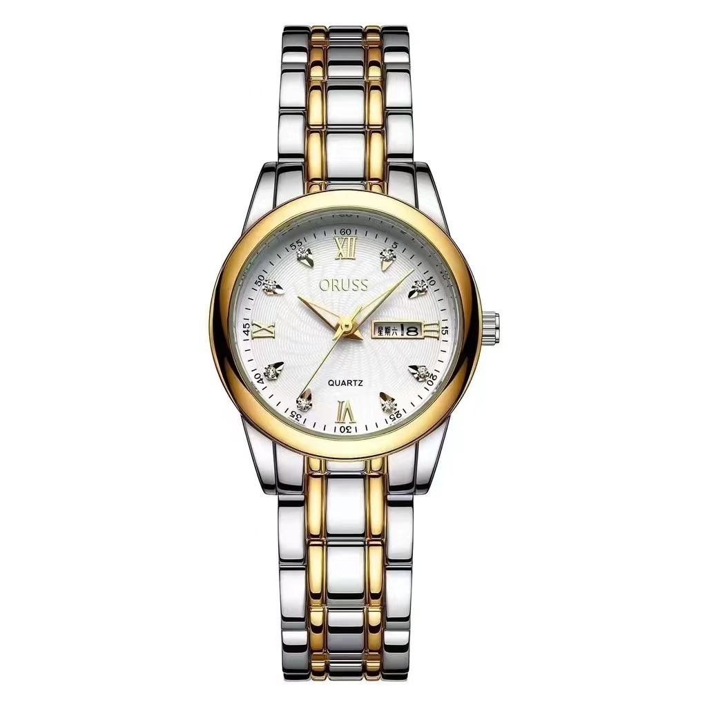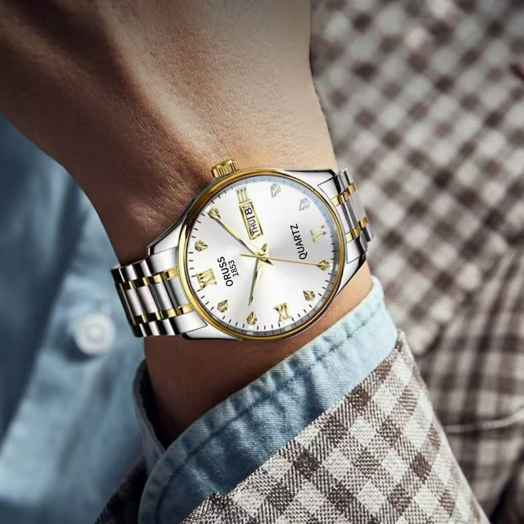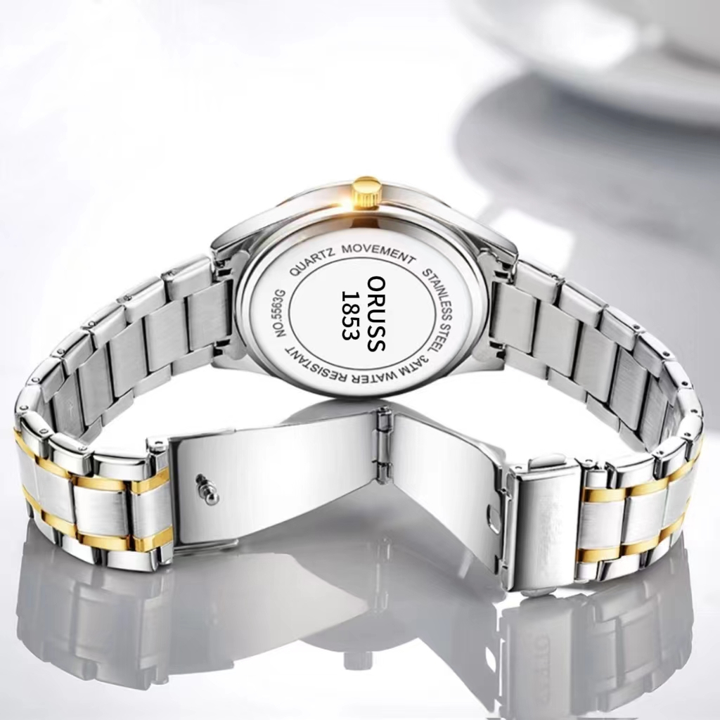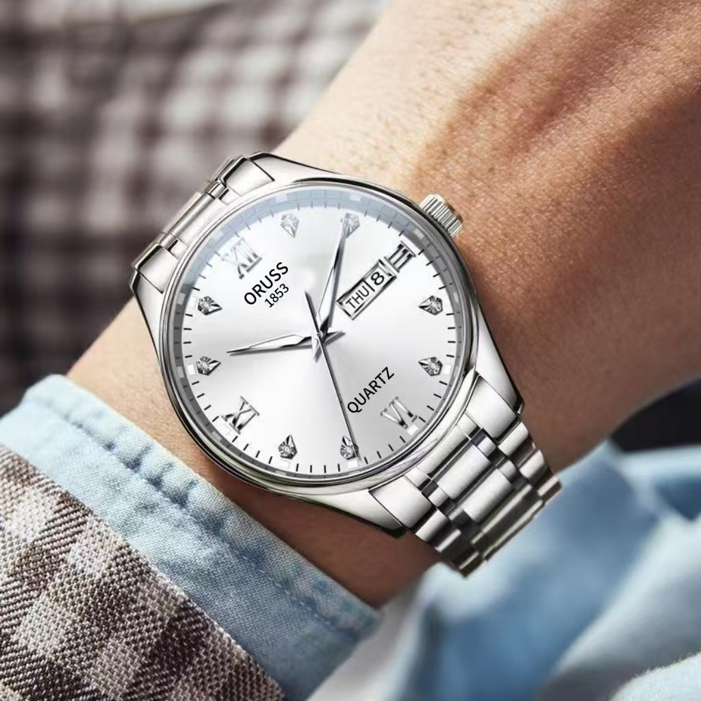 [Gift][With Box]ORUSS Original Men Stainless Steel Luxury Dual Calendar Luminous Waterproof Gold/Silver Watch Analog Business Korean Automatic Fashion Quartz Watch For Men