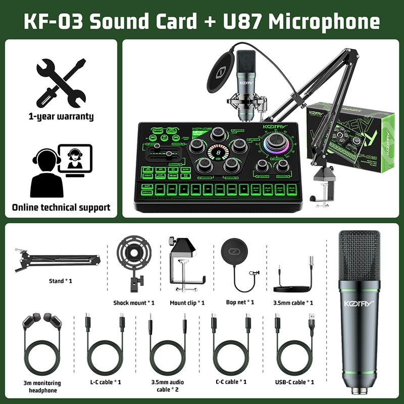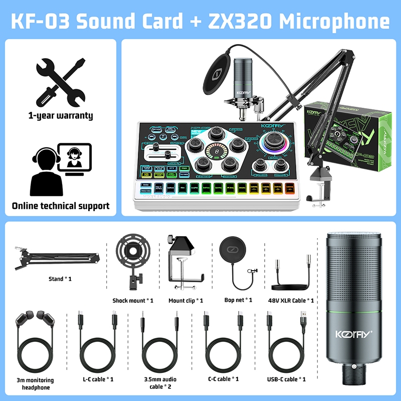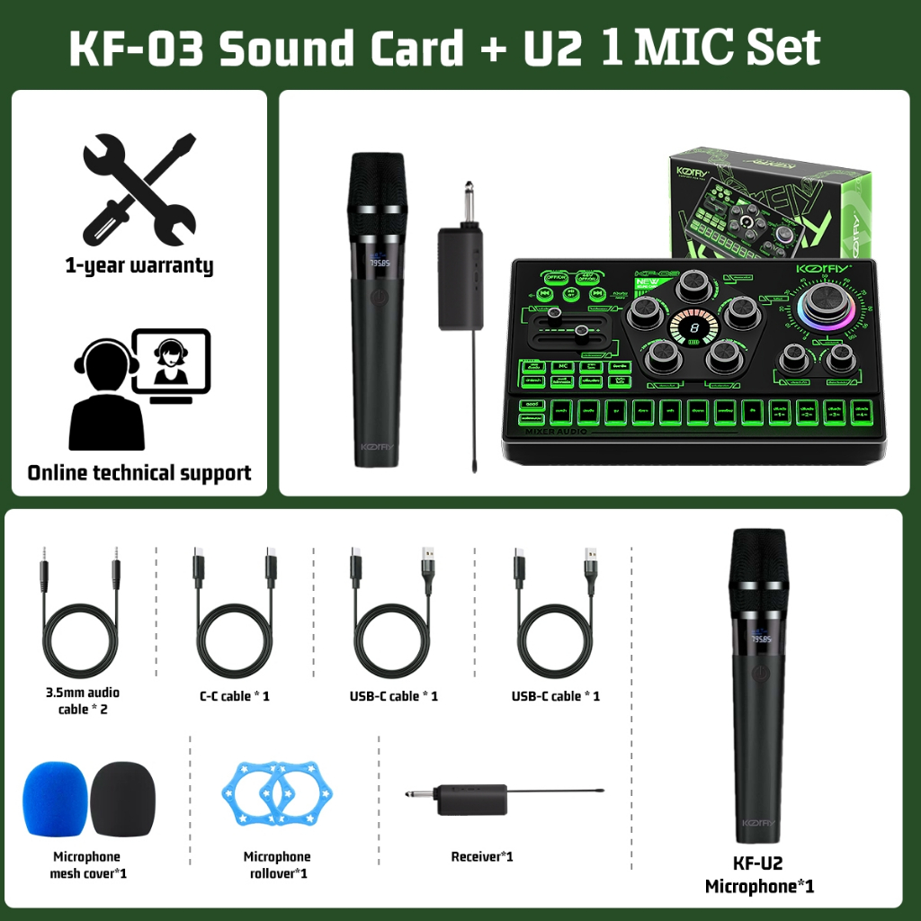 KOORFLY KF03 Live Sound Card 48V Audio Mixer for Streaming with Voice Changer,Singing Equipment Kit