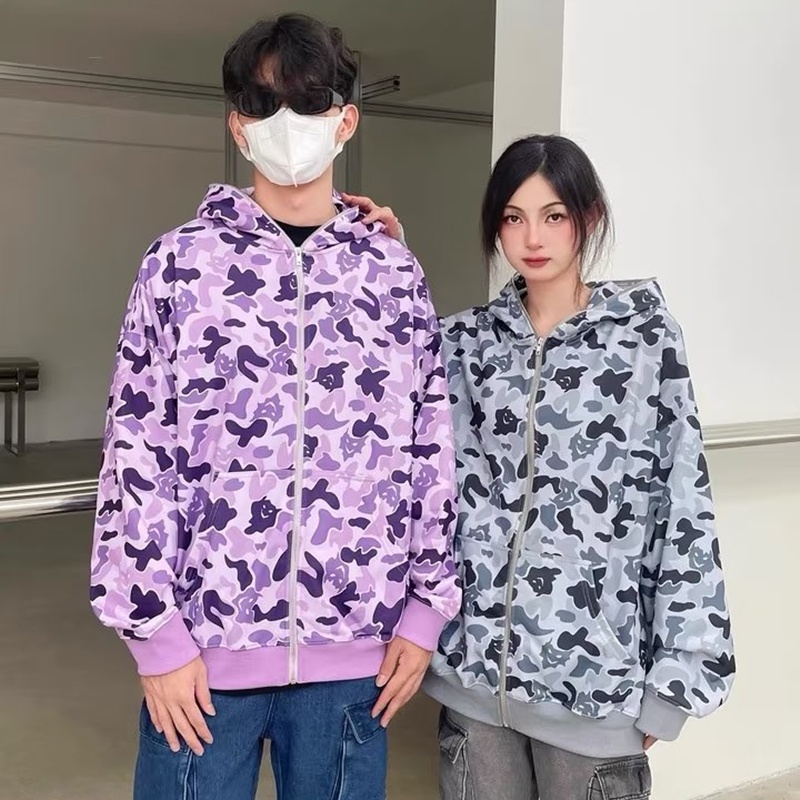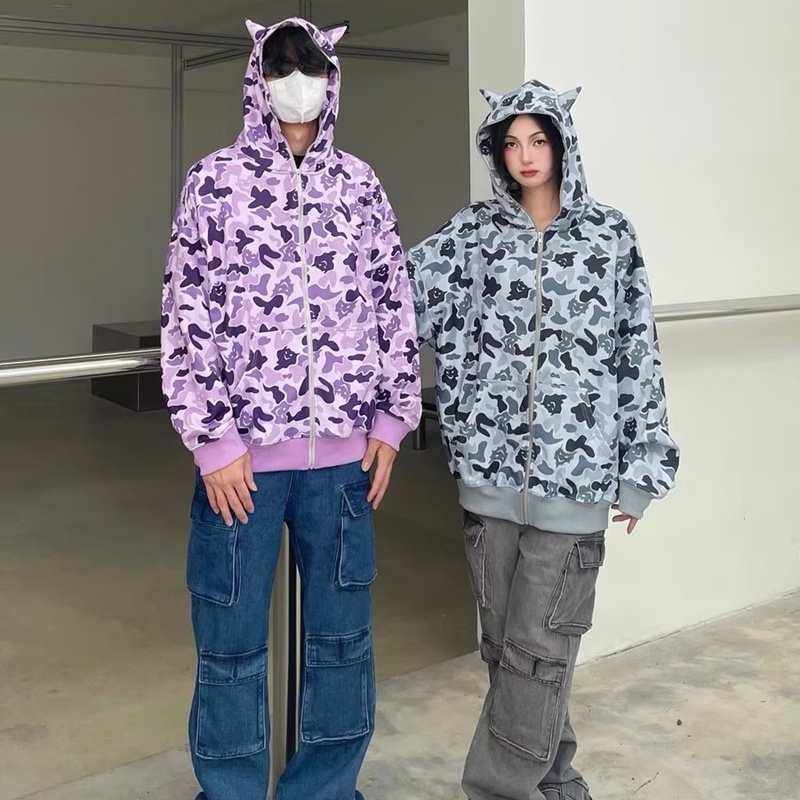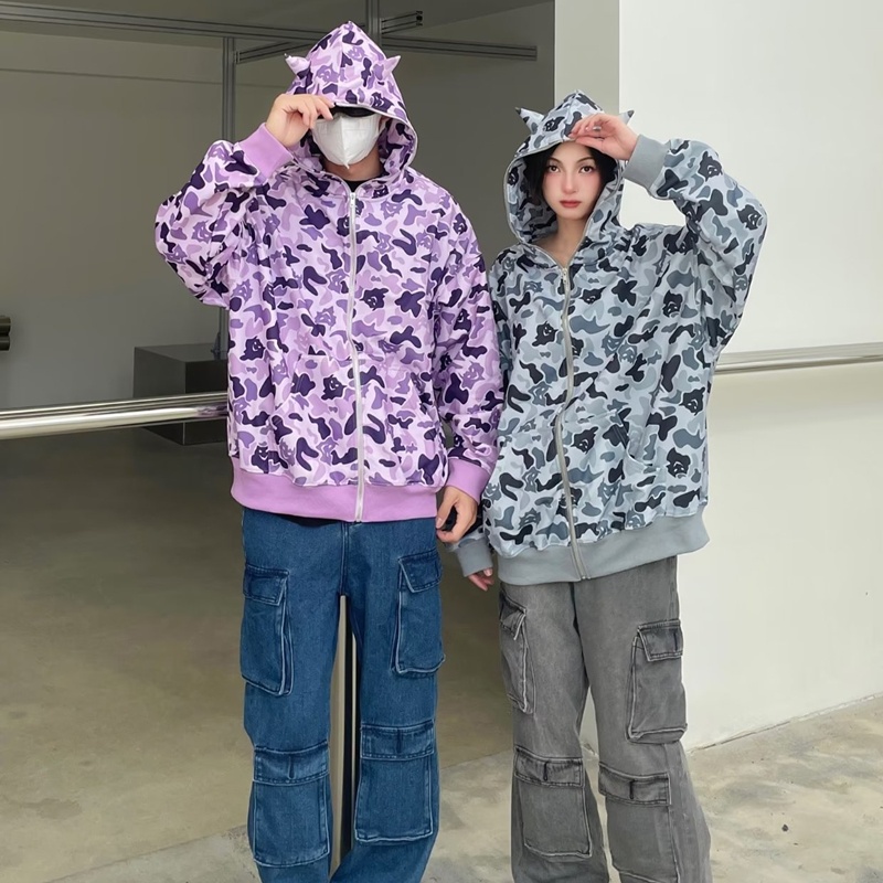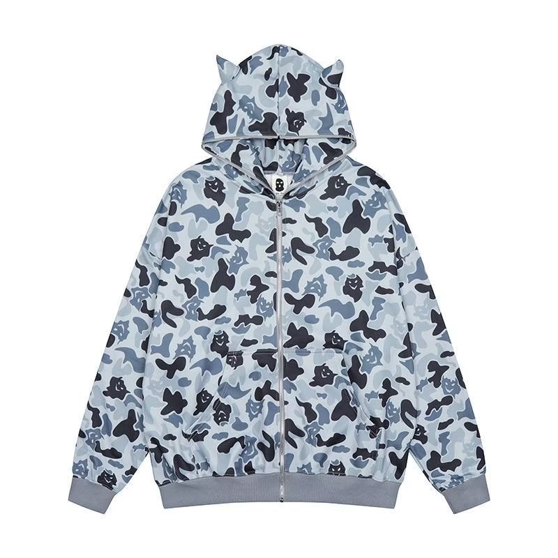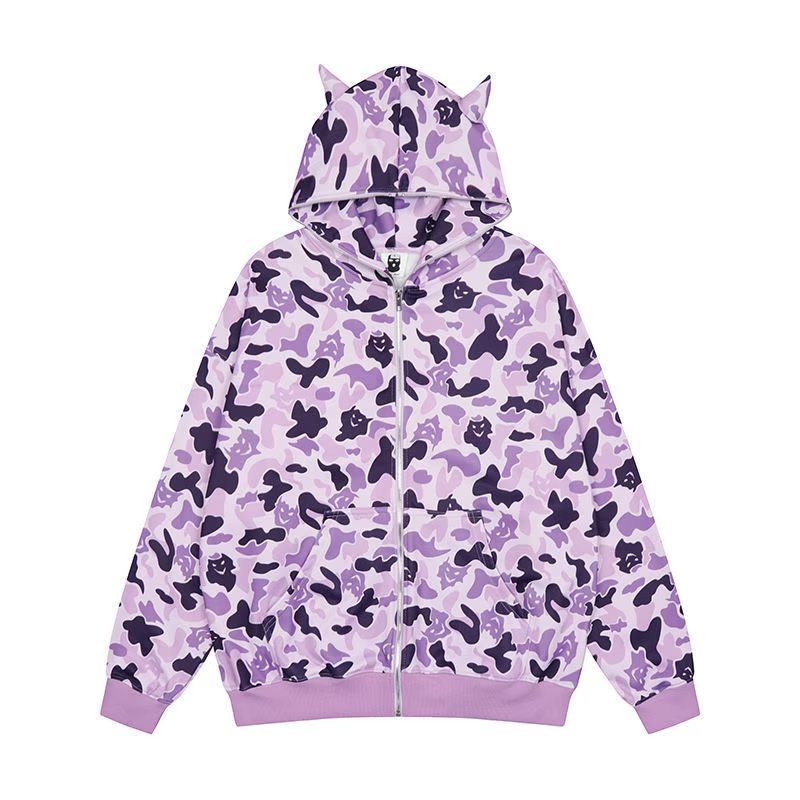 [M-2XL] Purple Camouflage Cute Little Devil Hat Zipper Sweatshirt Men Spring Autumn Long-Sleeved Hooded Jacket