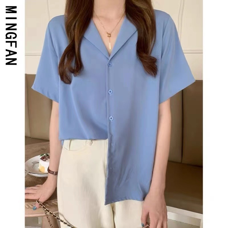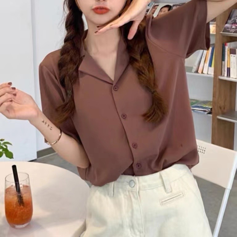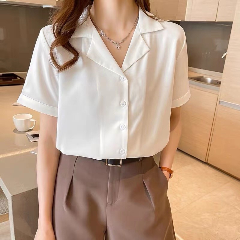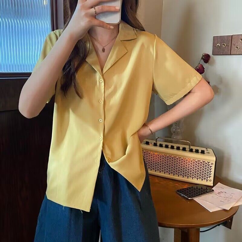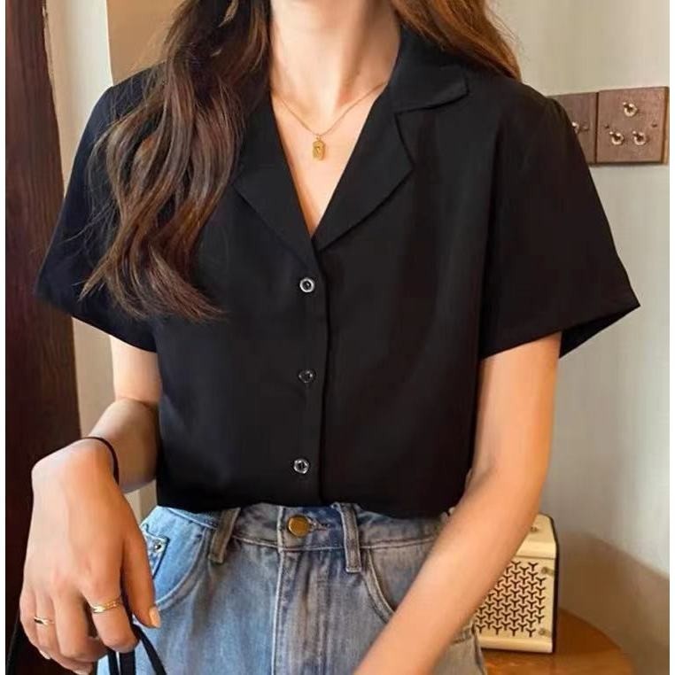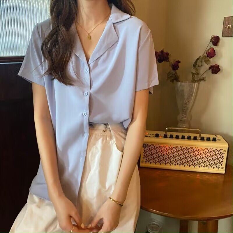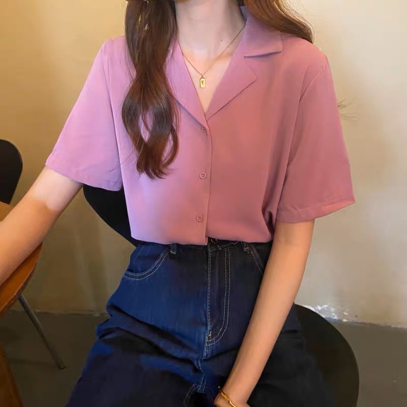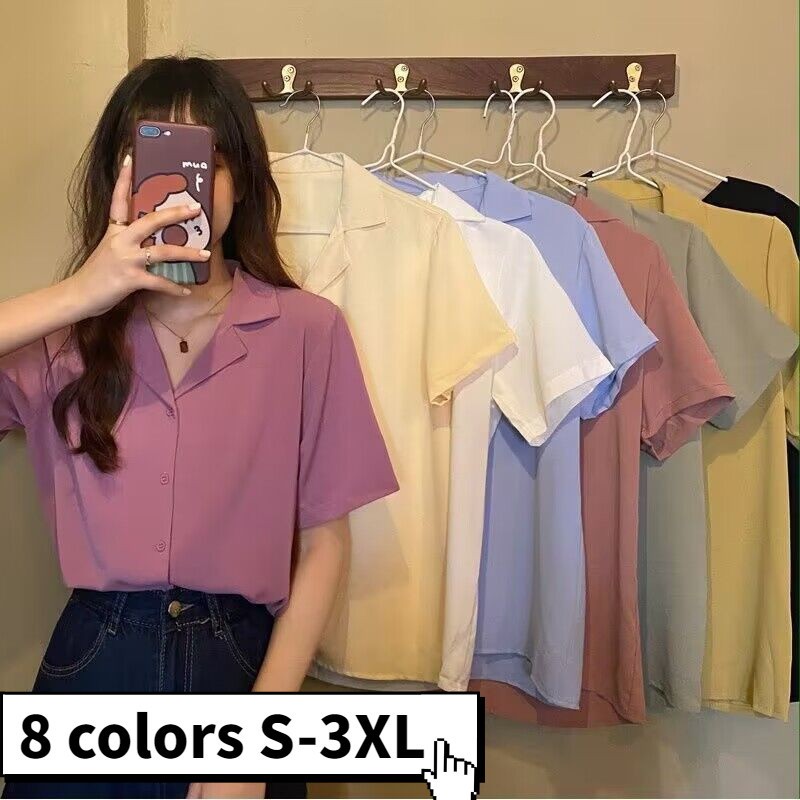 {Shipped From Manila+COD} Summer Korean Style Blouse for Women Girls Student Teens Lapel V Neck Short Sleeve Plain Candy Color Casual Work Office Holiday Loose Shirt Tops