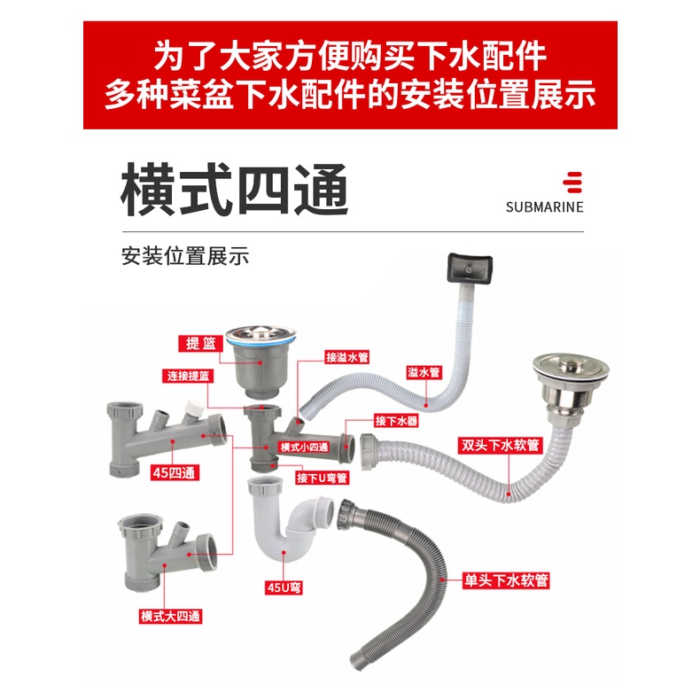 Vegetable Sink Sewer Overflow Pipe Fittings Kitchen Single Double Sink Dishwasher Sink Drain Pipe Deodorant Overflow Tee Pipe [XHY]