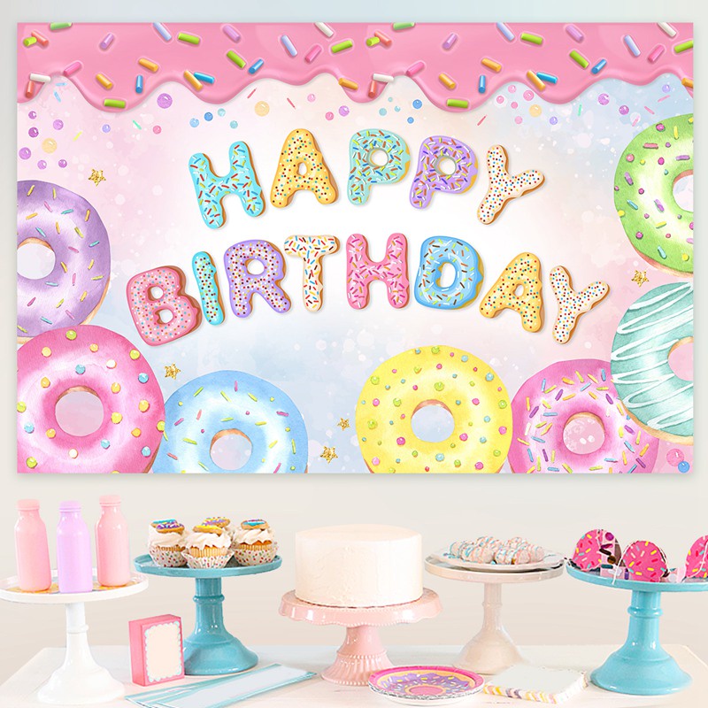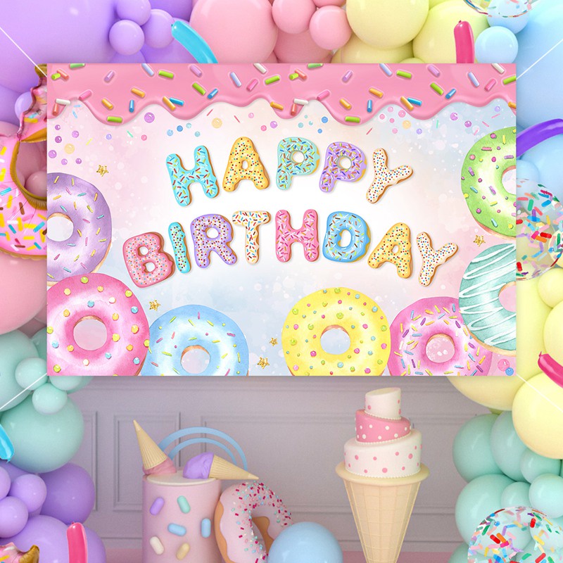 1*1.5M Donut Birthday Backdrop Doughnut Happy Birthday Banner For Girls Sweet Donut Theme Party Decorations Background Wall Cloth Backdrop For Birthday Photography Background