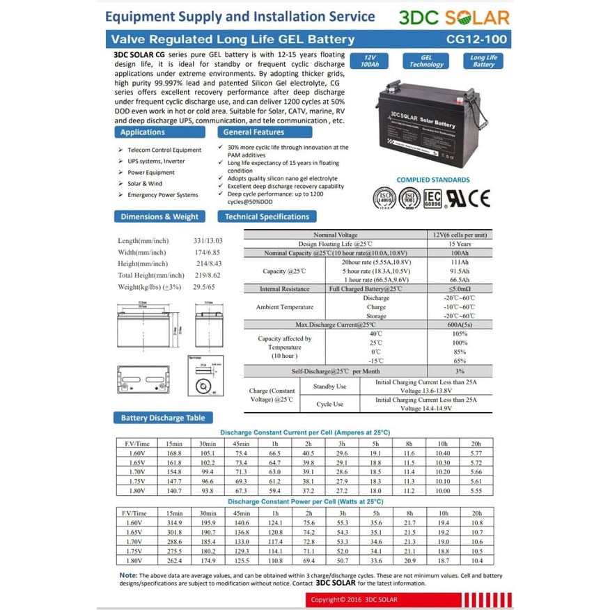 100 AH | 12V | Solar Power Battery | 3DC Solar | Deep Cycle Germany Gel Technology
