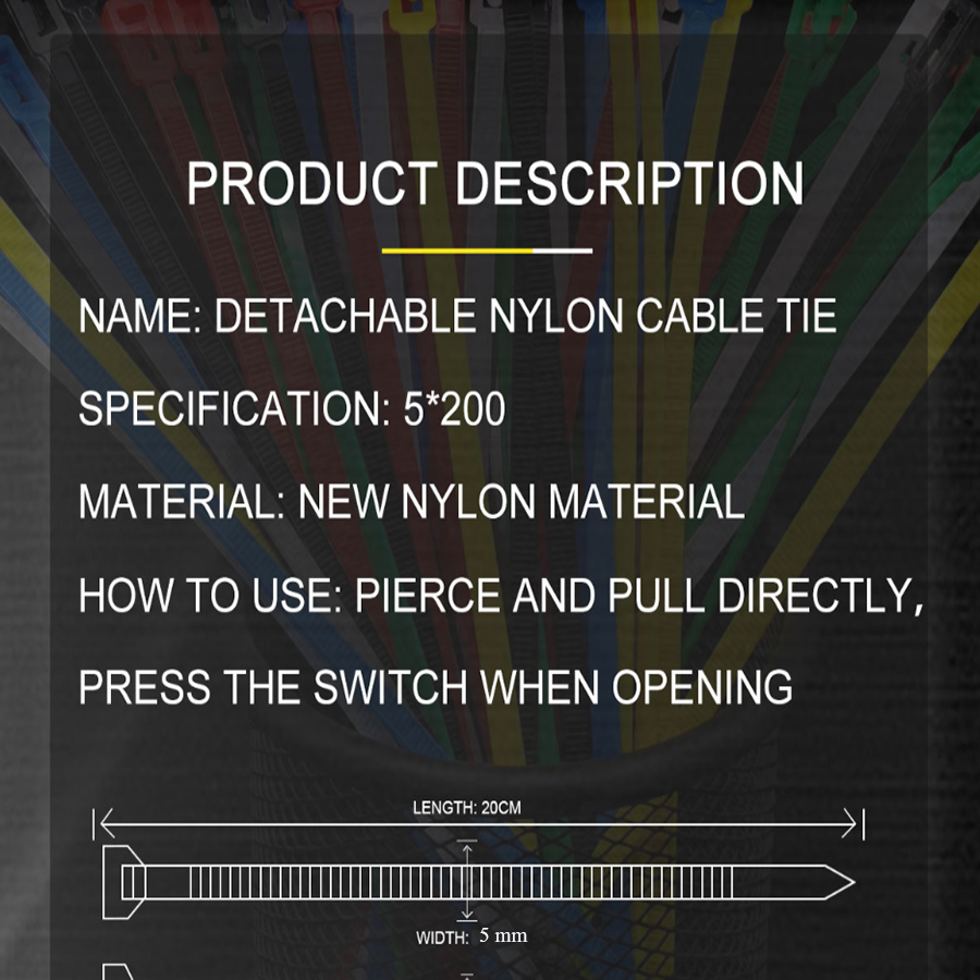 100PCS 5*200MM Releasable Cable Ties /Colored Plastics Reusable Cable Ties/ Loop Wrap Nylon Zip Ties Bundle Ties