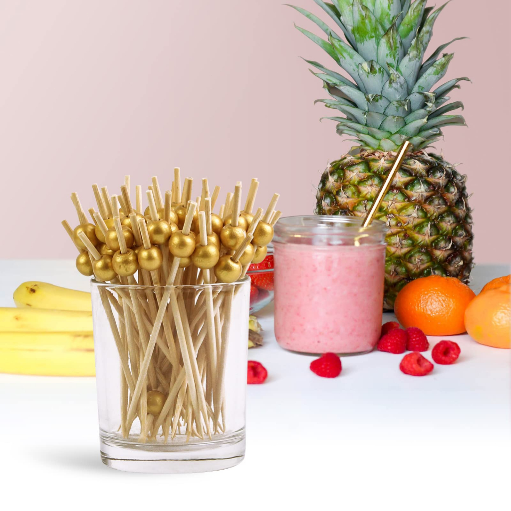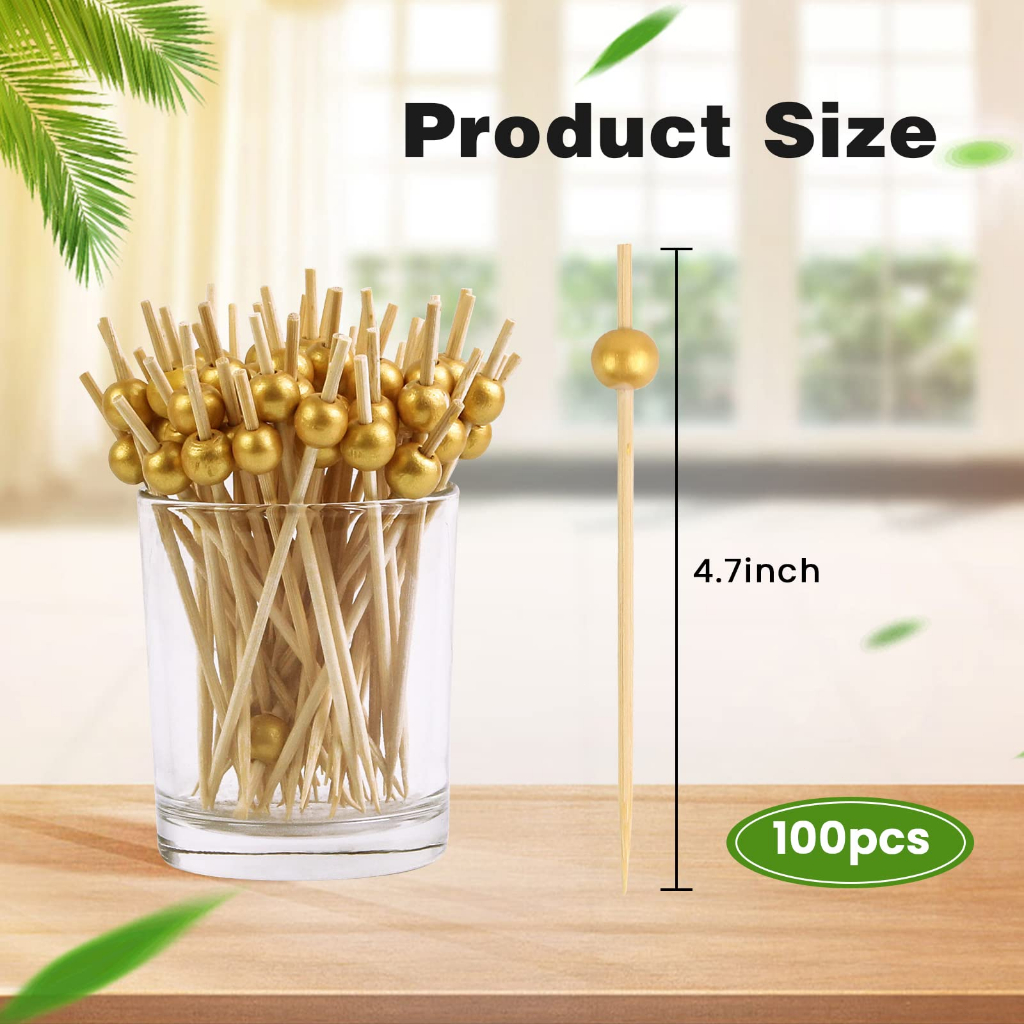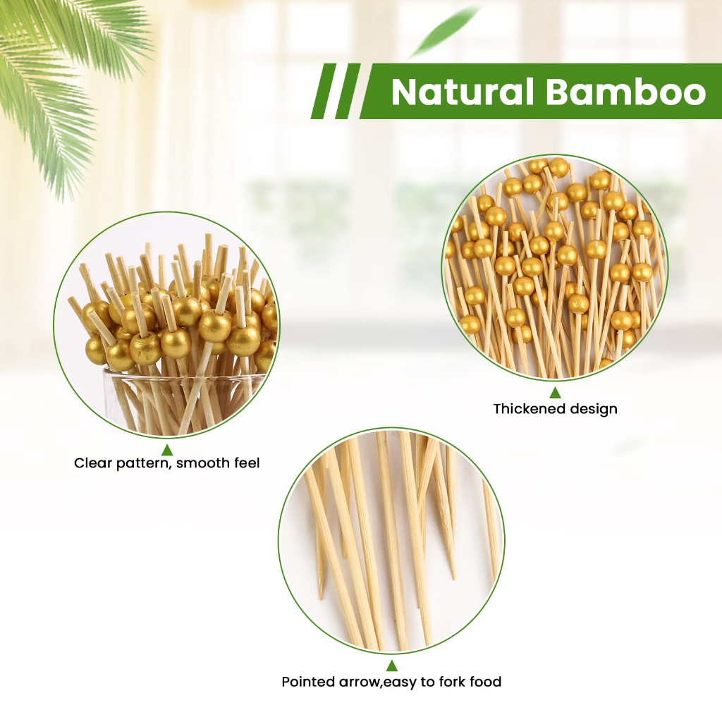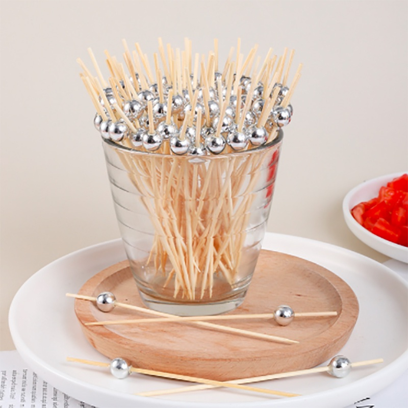 100pcs Gold Beads Bamboo Sticks Fruit Salad Stick Party Cocktail Pearl Picks Food Decor Toothpicks