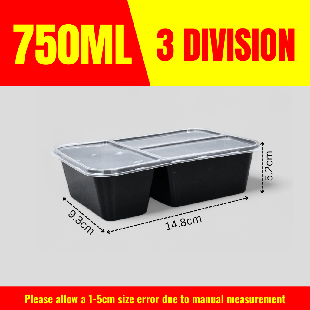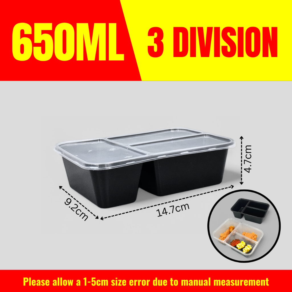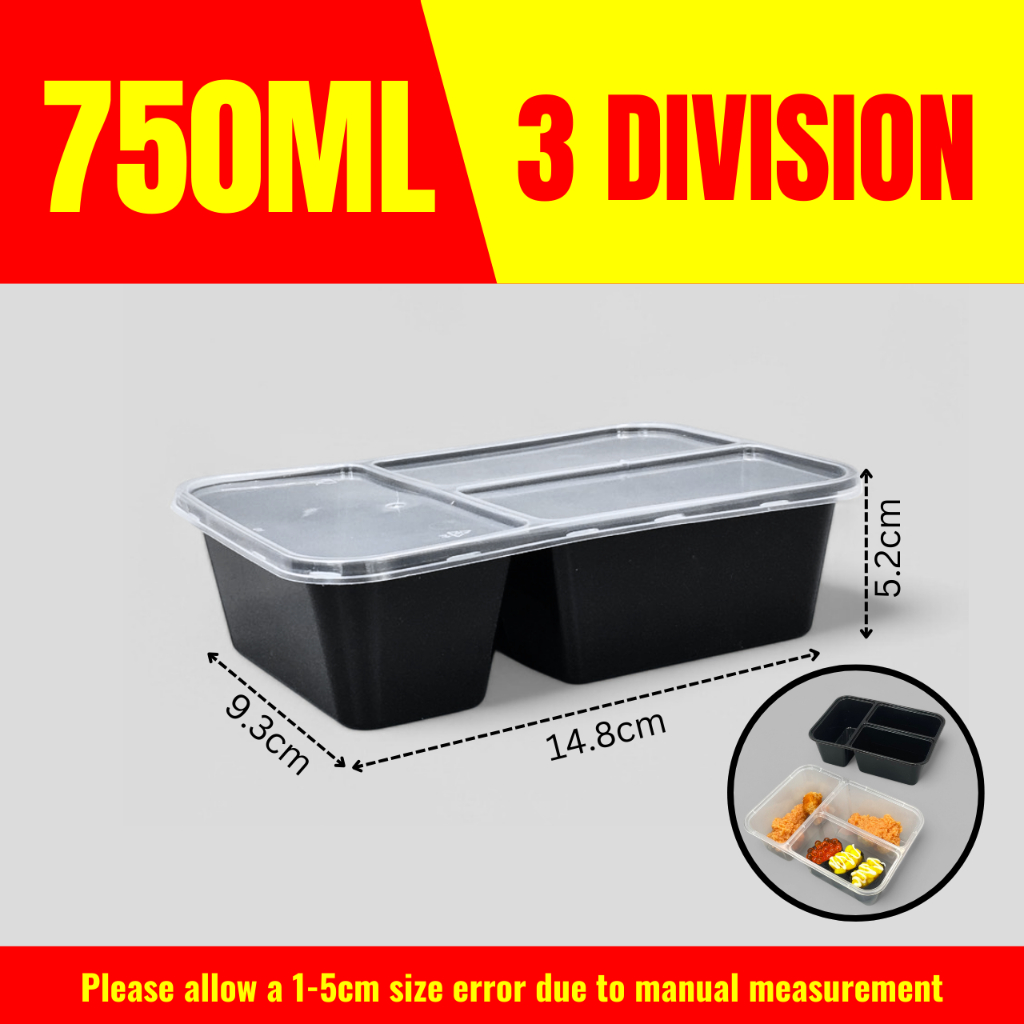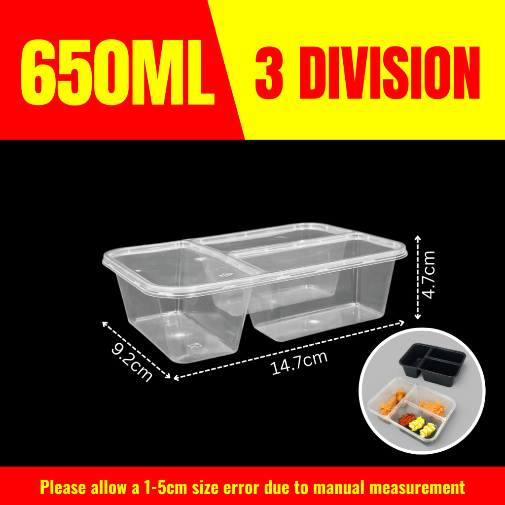 10pcs 3 Division Microwavable Container Clear/Black Plastic Disposable Lunch Box 500ml/650ml/750ml