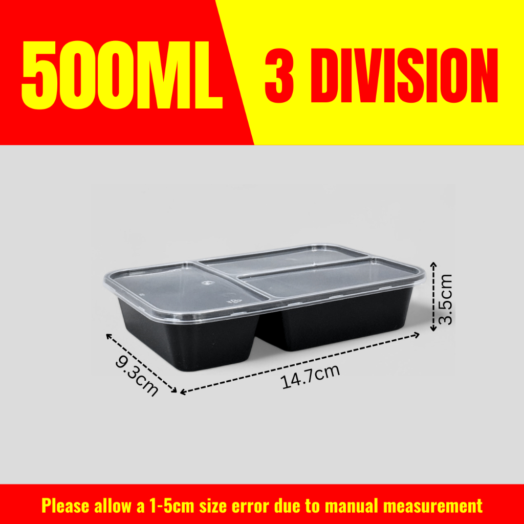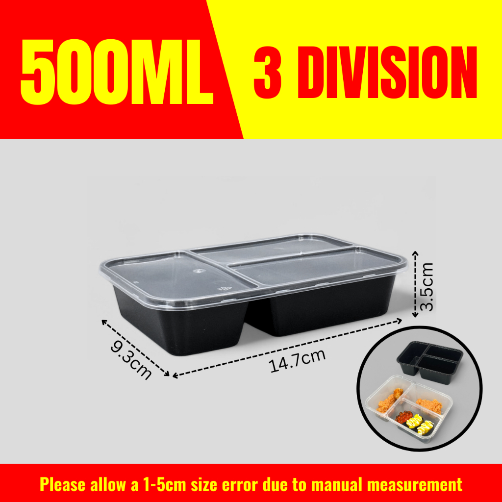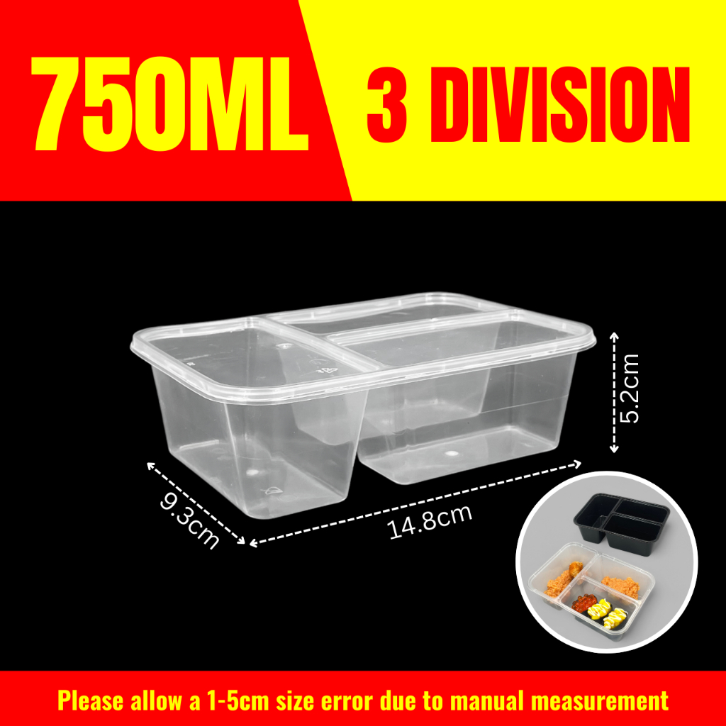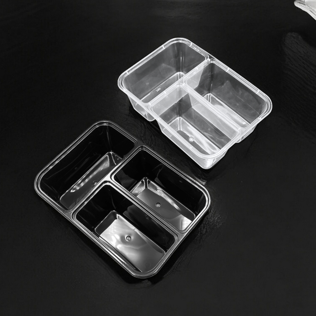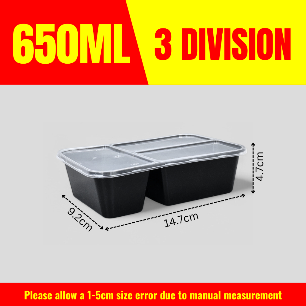 10pcs 3 Division Microwavable Container Clear/Black Plastic Disposable Lunch Box 500ml/650ml/750ml