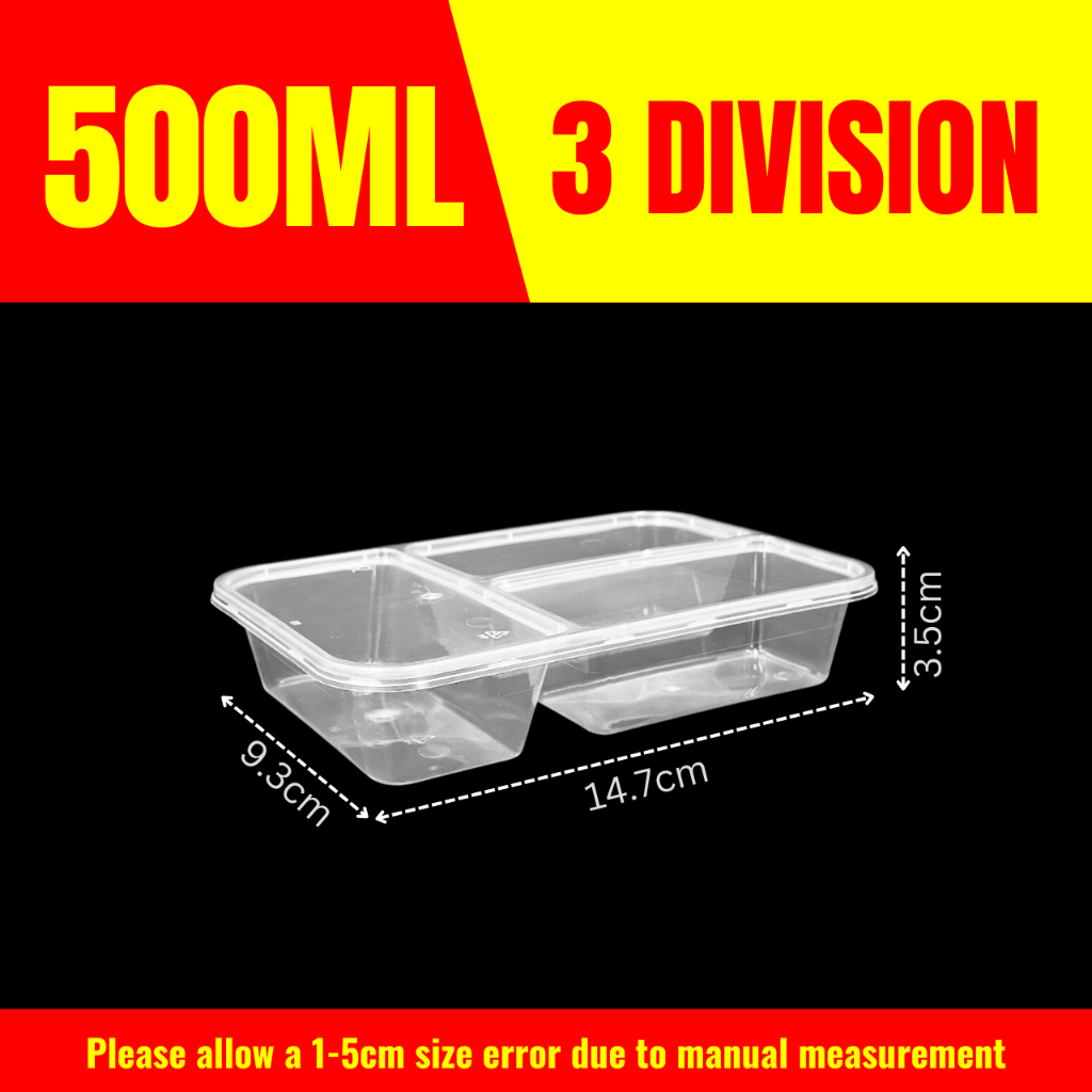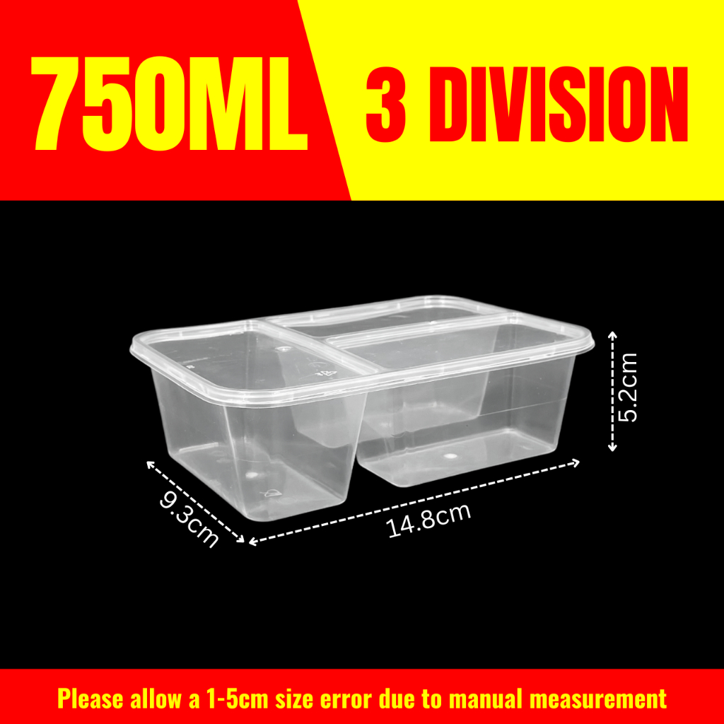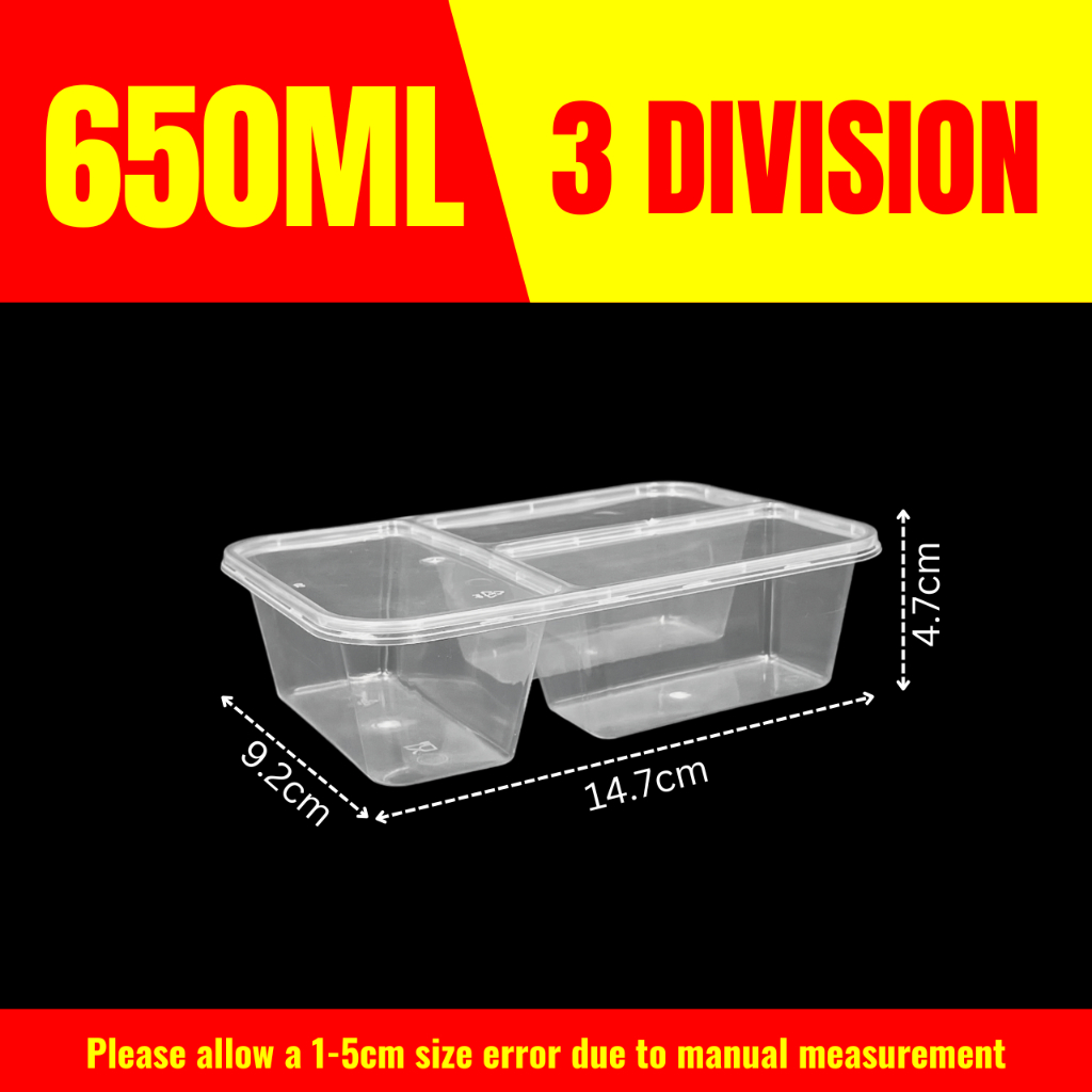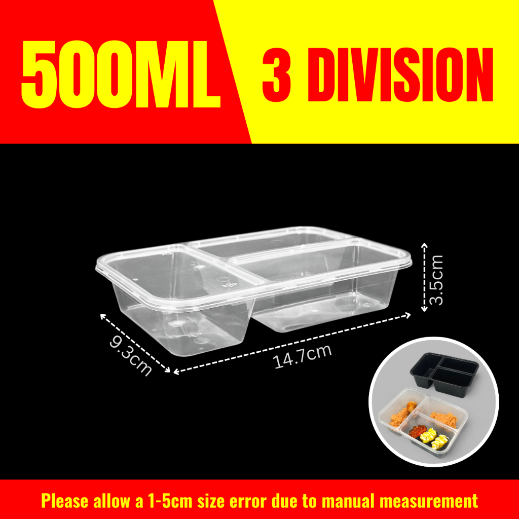 10pcs 3 Division Microwavable Container Clear/Black Plastic Disposable Lunch Box 500ml/650ml/750ml