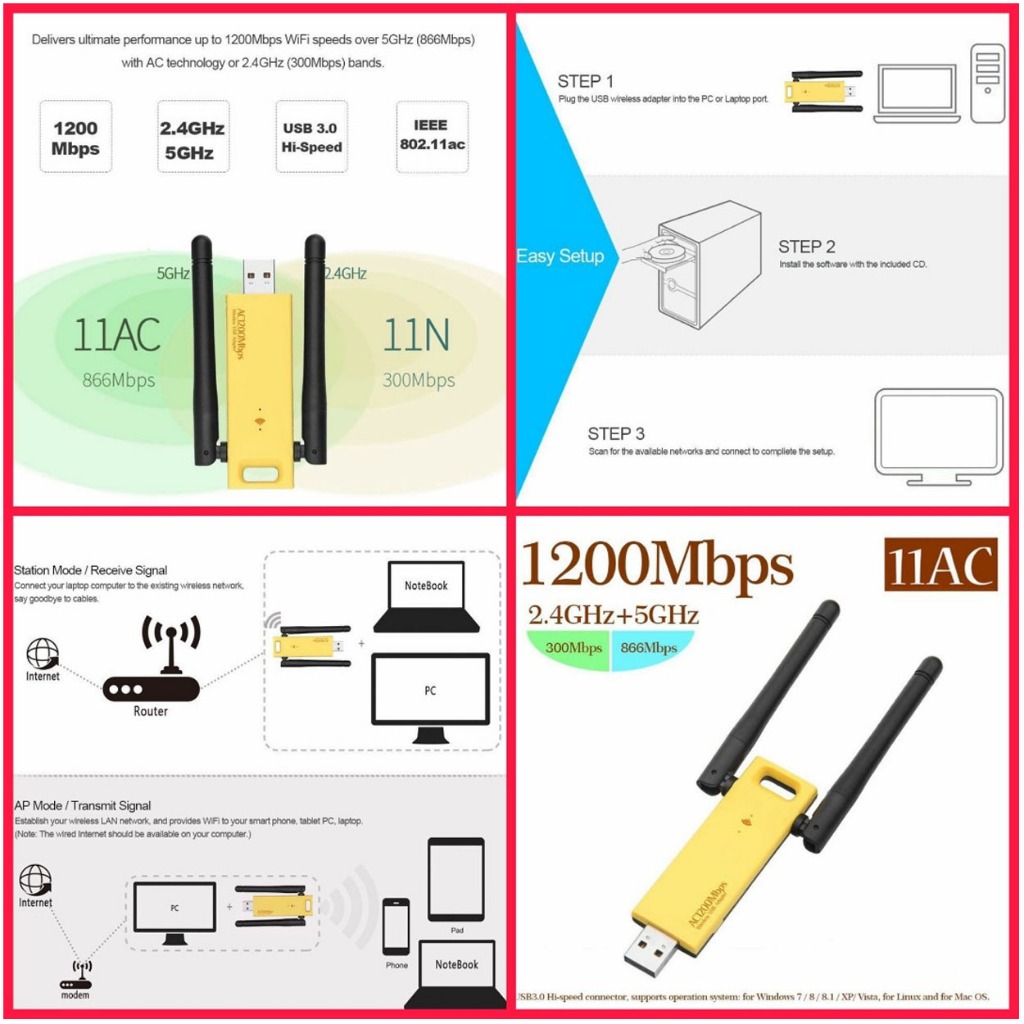 1200 Mbps AC1200 USB Dual Band Wireless USB Adapter WiFi 2.4 GHz / 5.0 GHz Wireless Network Adapter