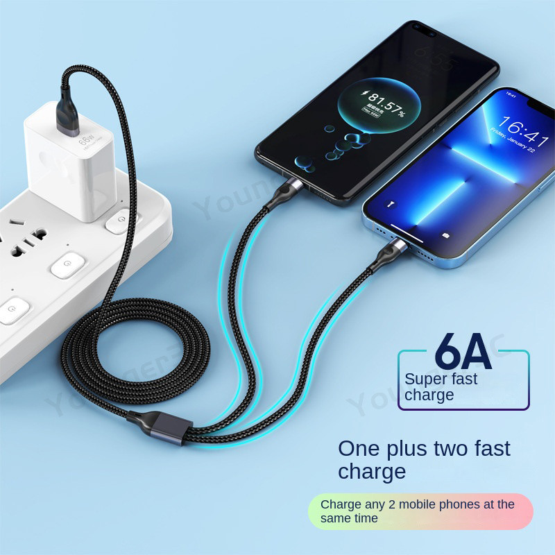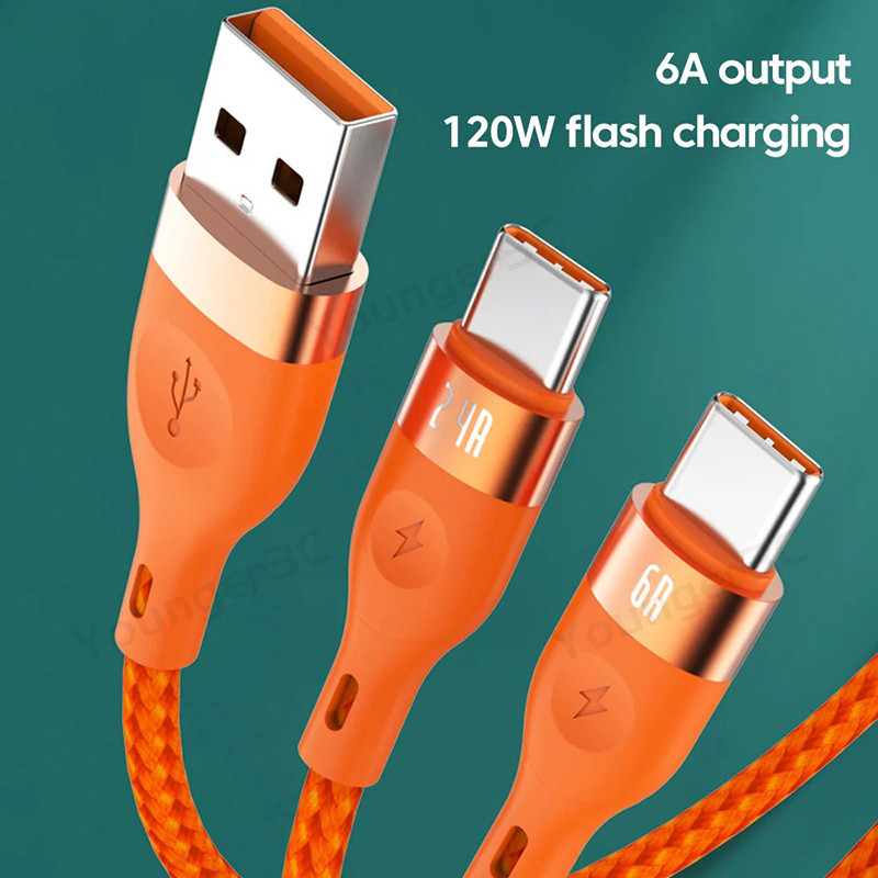 120W Super Fast Charging Cable 2 In 1 Dual Head Flash Data Cable 6A Transmission Charge Cord For ios Android Type C