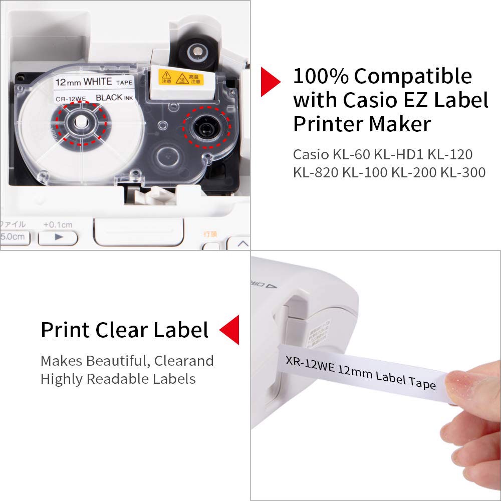 12mm Label Tape Compatible Casio Label Printer XR Tape XR-12WE XR12WE XR-12X XR-12YW XR-12BU XR-12GN for Casio Refill Tape KL130 KL60 KL120 KL100 KL200 KL750 Casio Label Printer