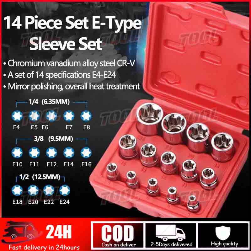 14 pcs E-Type Star Socket Set 1/4" 3/8" 1/2" Female External Star Socket Set, E4 - E24 Torque Socket