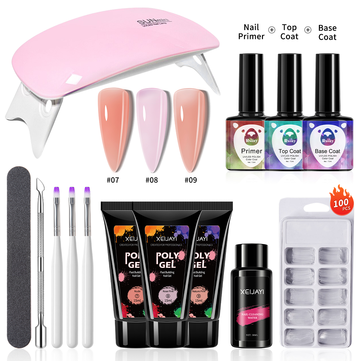 14-piece 15ml Poly Nail Gel set for extensions, featuring base/top coat, cleaning water, mold, and beginner tools.