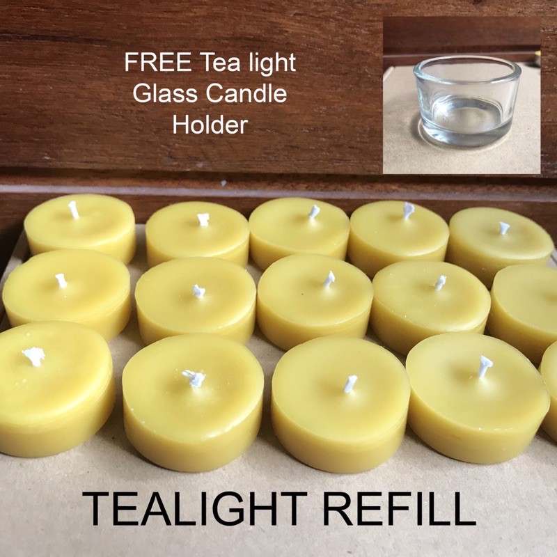 15 Small Pure Beeswax Tea Light REFILL with FREE Votive Glass - 100% Organic by Luxzerna