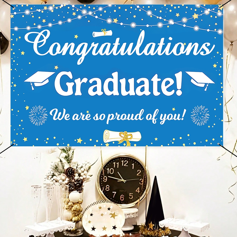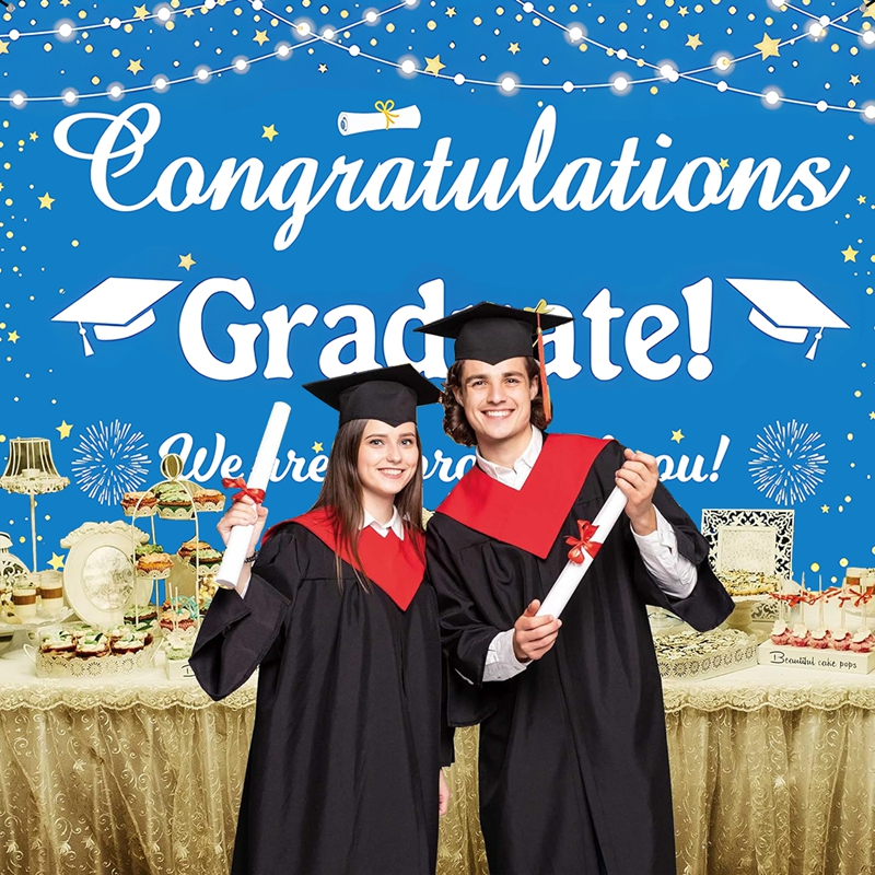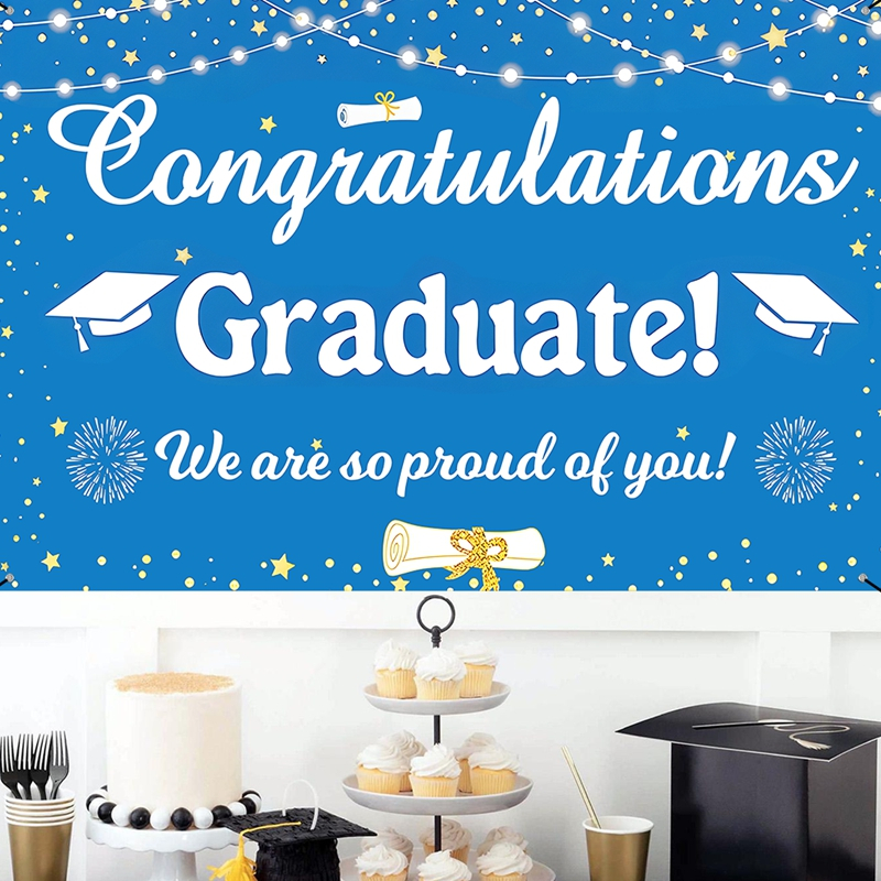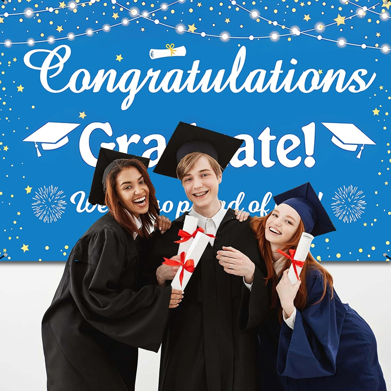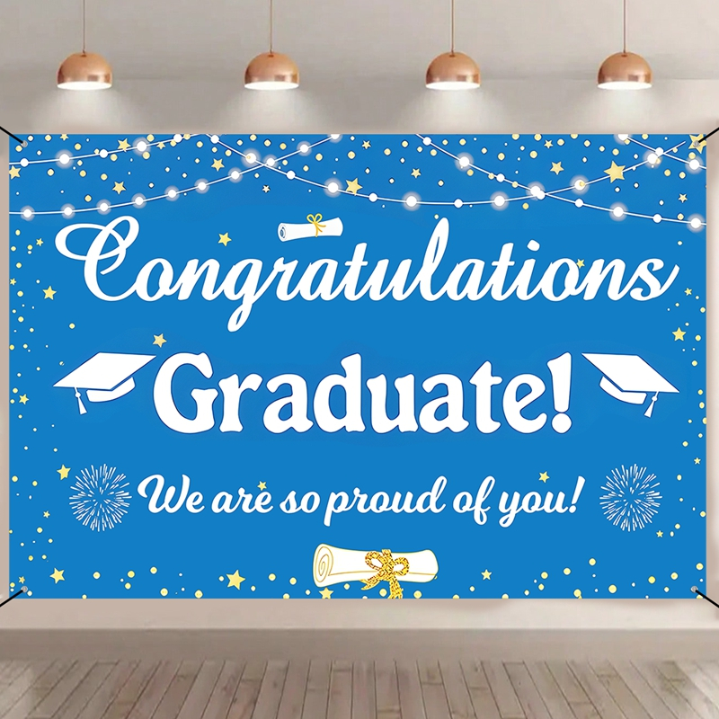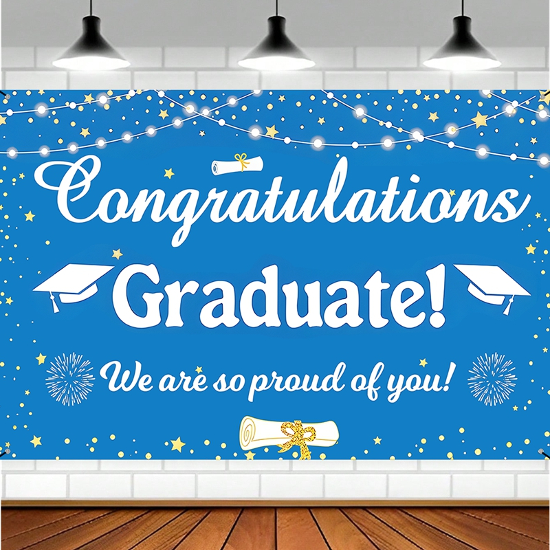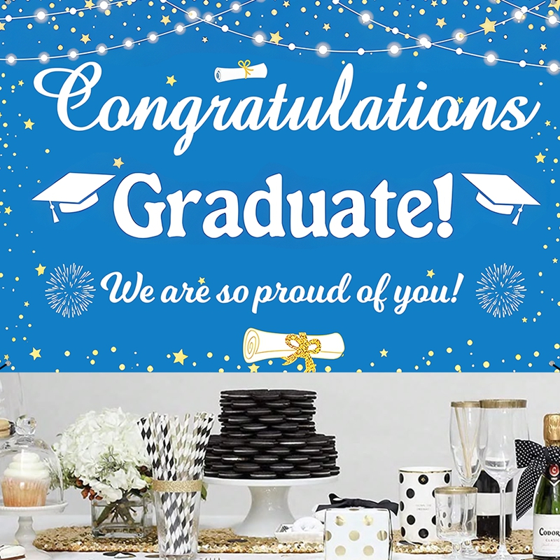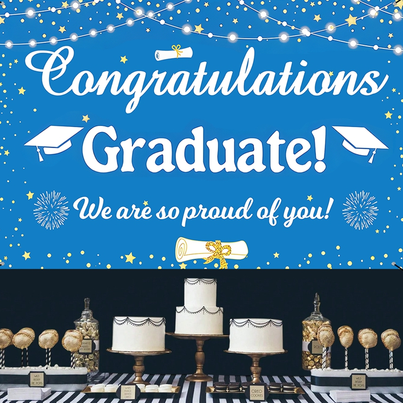 150*100cm Polyester Blue White Graduation Backdrop Congratulations Graduation Background Cloth Graduation Decoration Congrats Grad Party Supplies