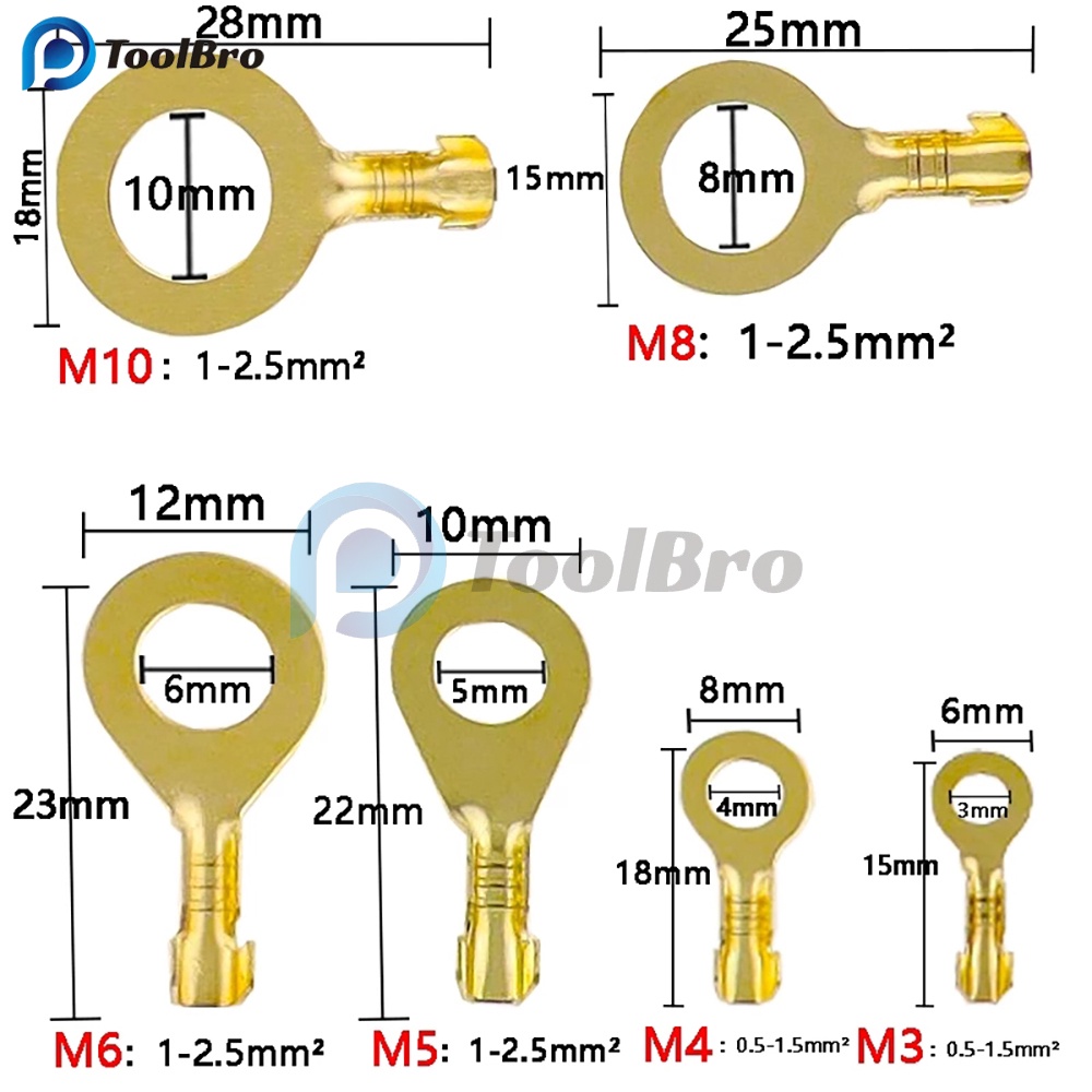 150pcs Insulated Brass Ring Crimp Terminals Wire Connectors Spade Electrical Kit M3 M4 M5 M6 M8 M10 Cable Lugs Set