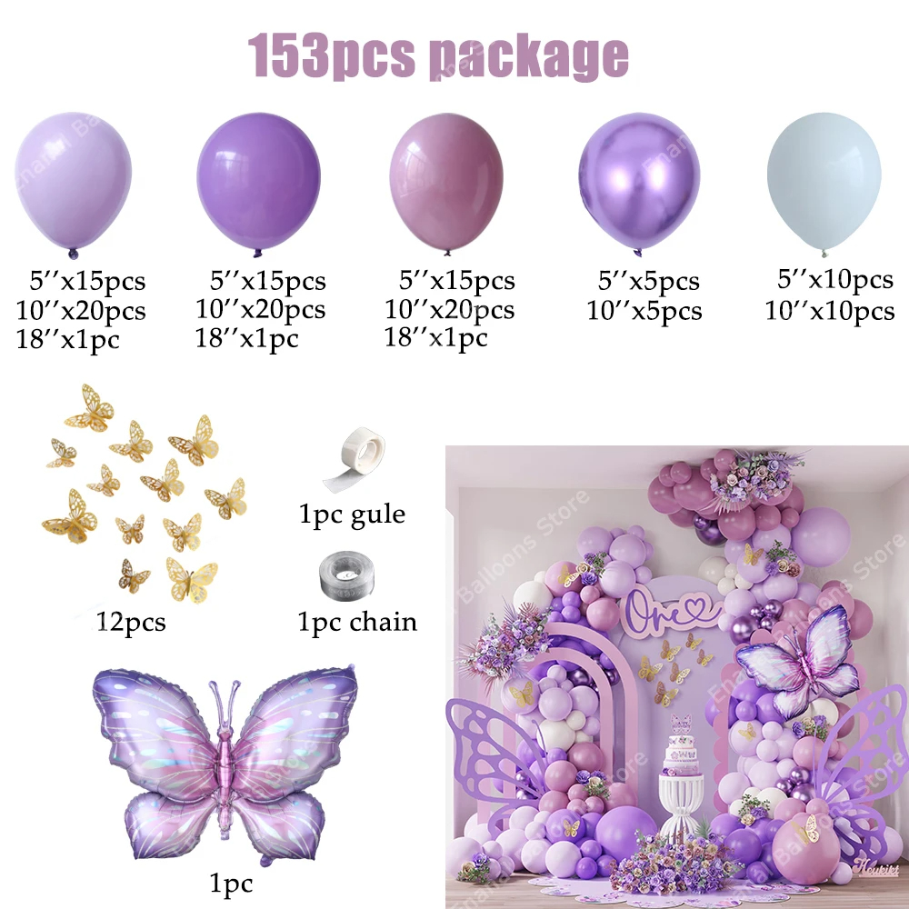 153pcs Pink Purple Butterfly Balloon Garland Arch Colorful Butterfly Foil Balloon Girl Birthday Party Baby Shower Wedding Decor
