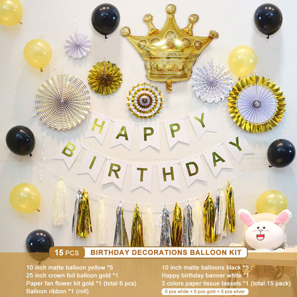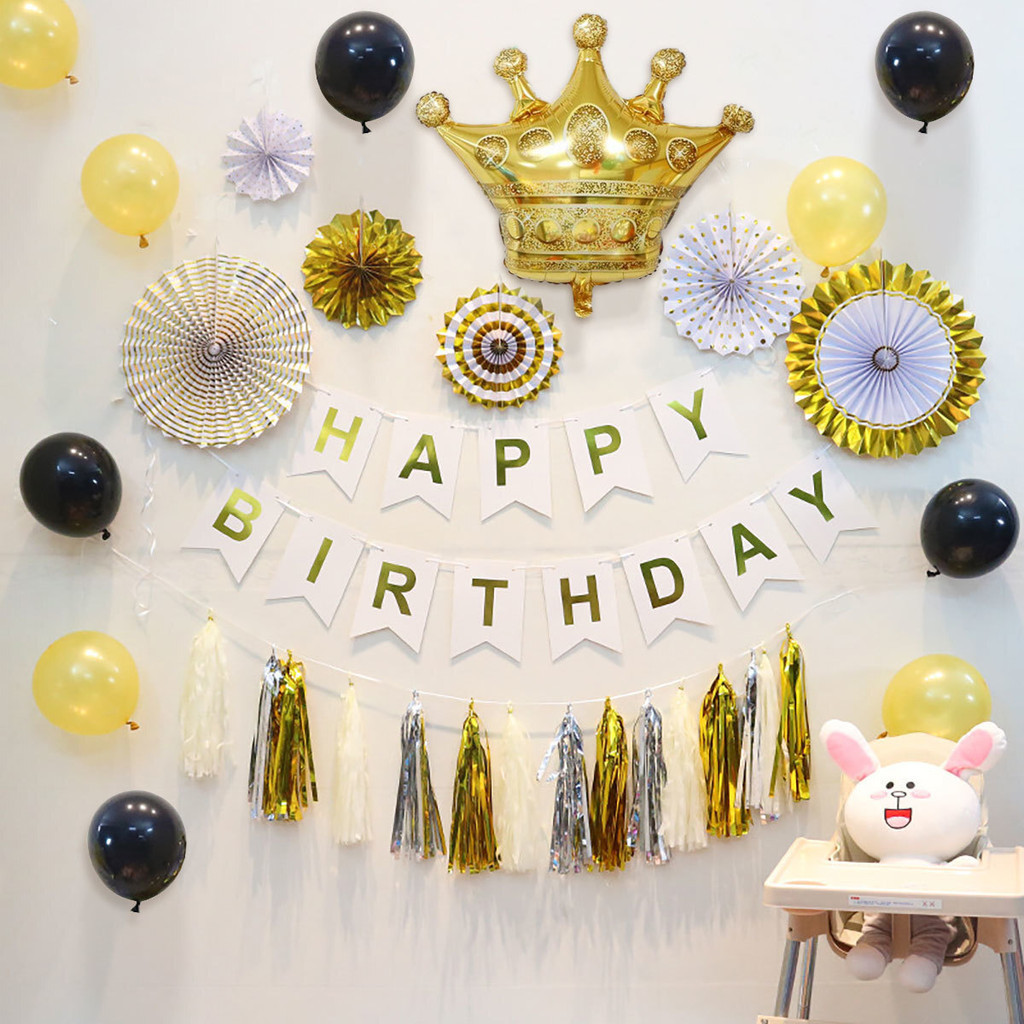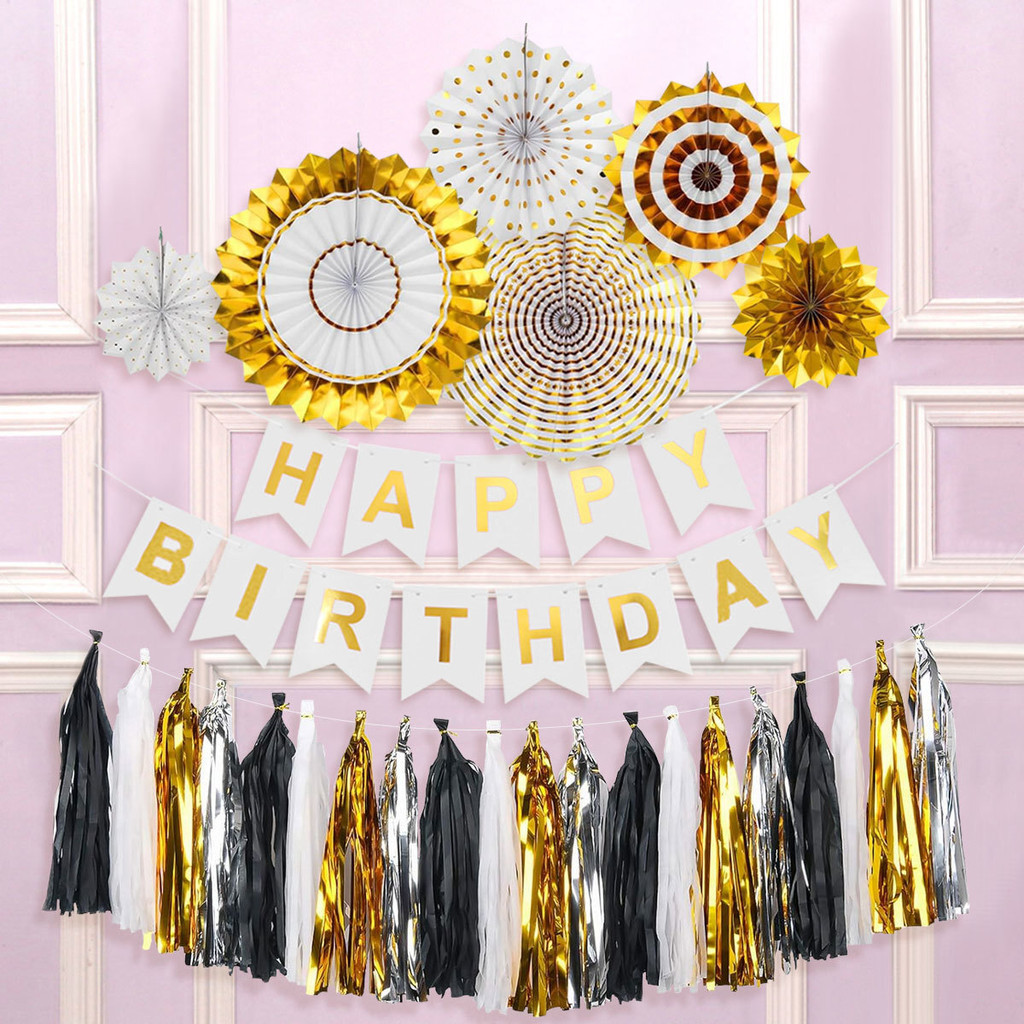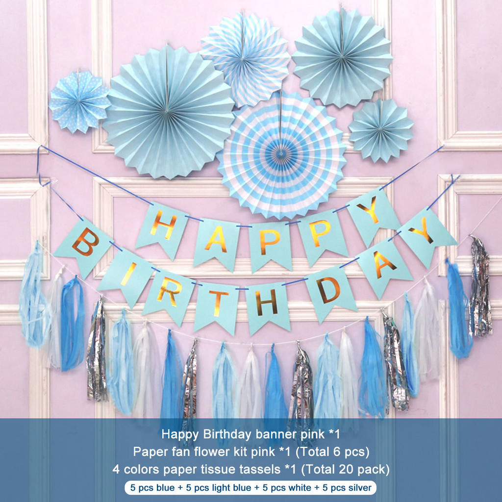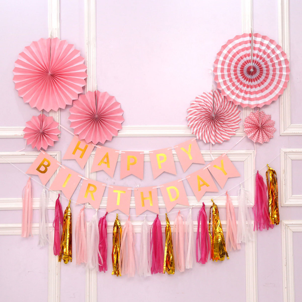 15pcs Party Decorations Set For Happy Birthday Banner Paper Tassel Fan Flower Balloon Bithday Decor