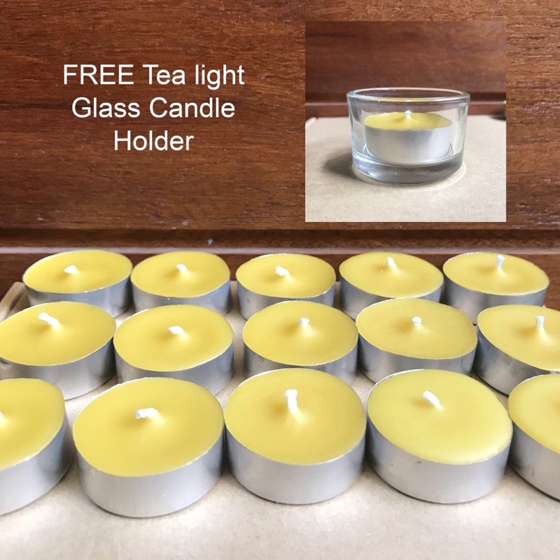 15pcs Small BEESWAX TEALIGHT (100% Natural) w/ FREE Tealight Glass Candle Holder by Luxzerna