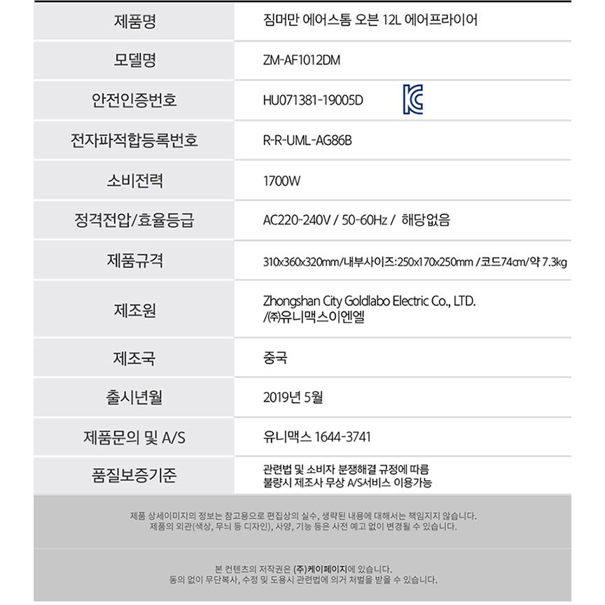 ZIMMERMANN Air Storm Oil Free Korean Air Fryer Electric Oven Rotisserie Food Dryer ZM-AF1012DM 12L B
