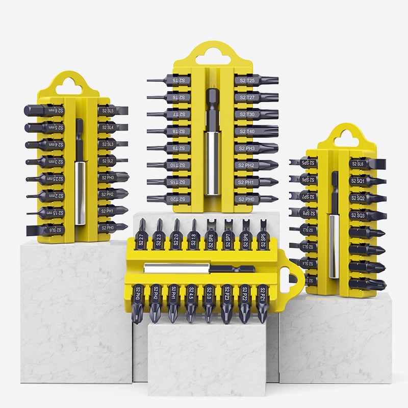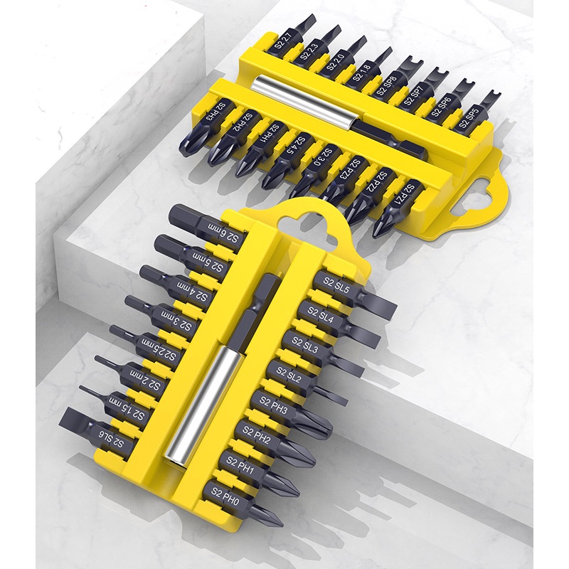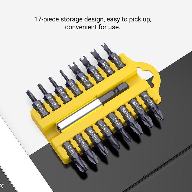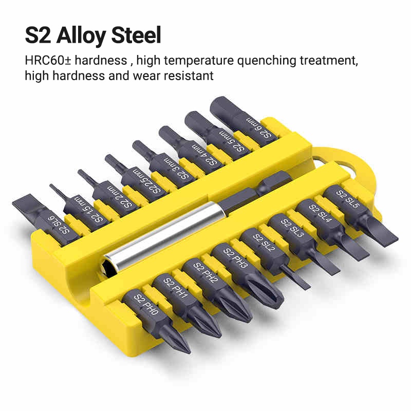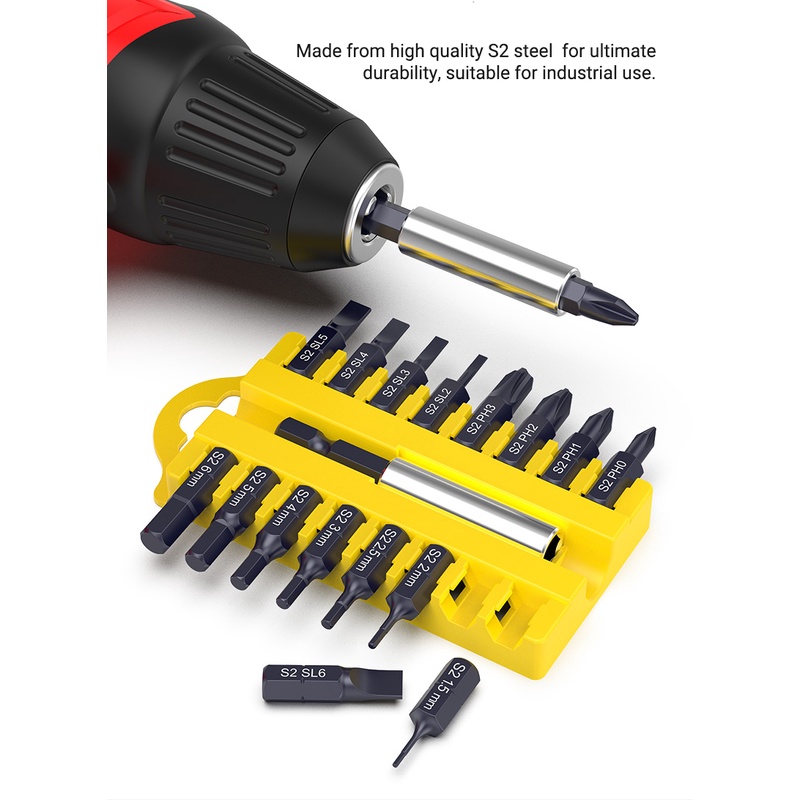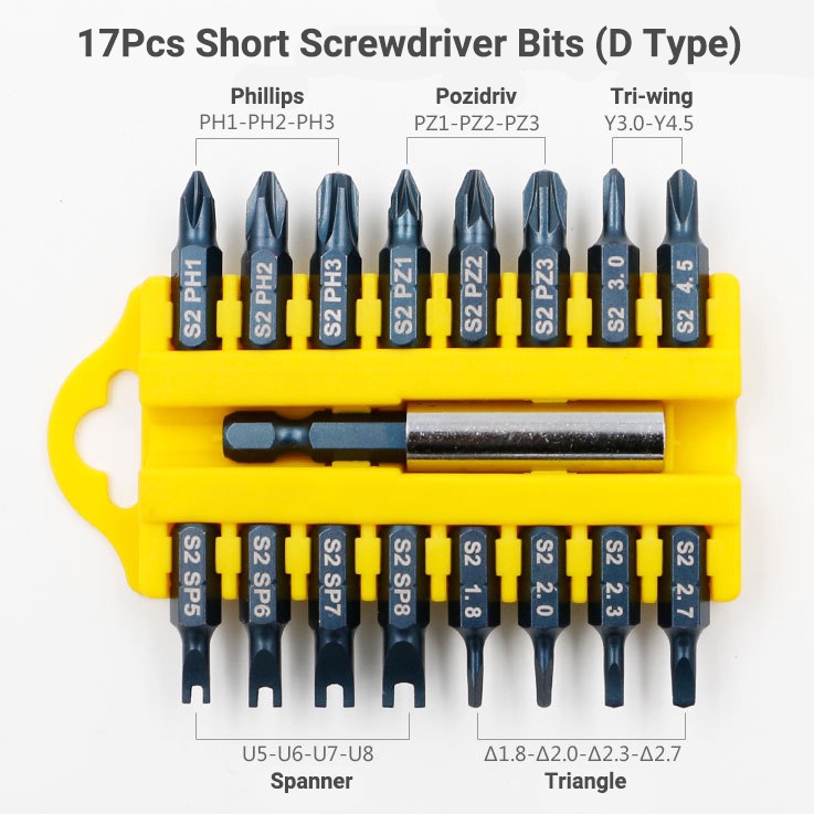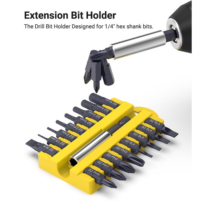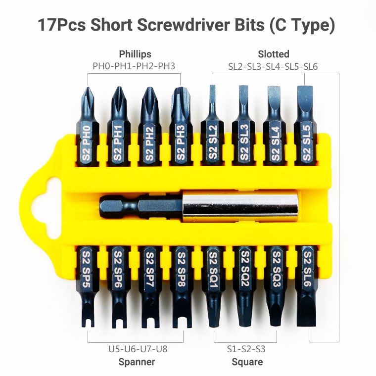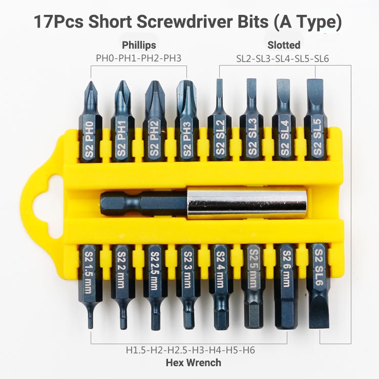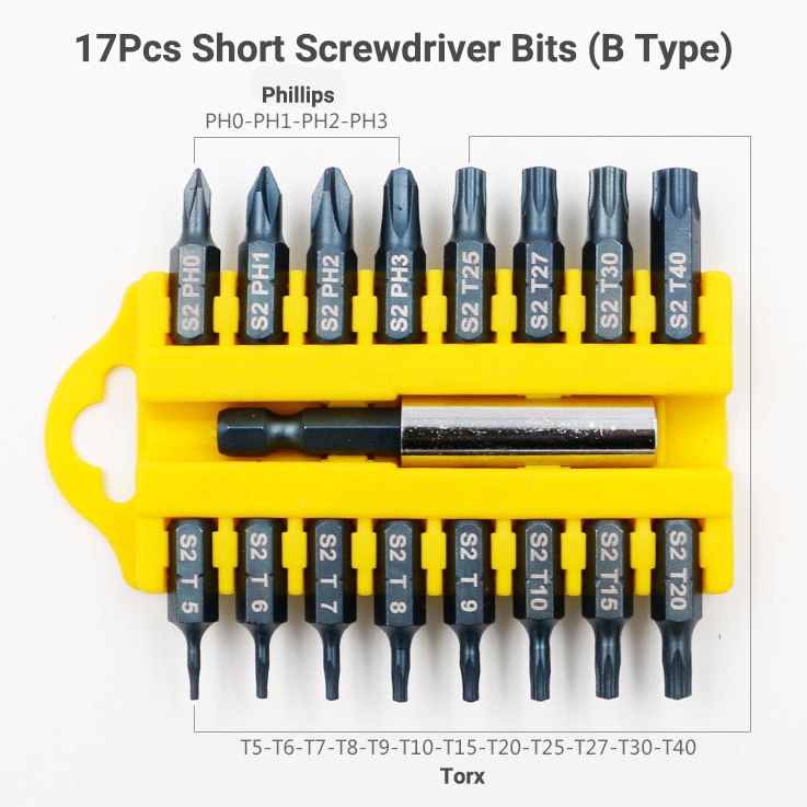 17Pcs S2 Steel Short Screwdriver Bits Phillips Slotted Torx Hex Wrench Driver Bit Set 1/4" Hex Shank with Extension Socket Drill Bit Holder