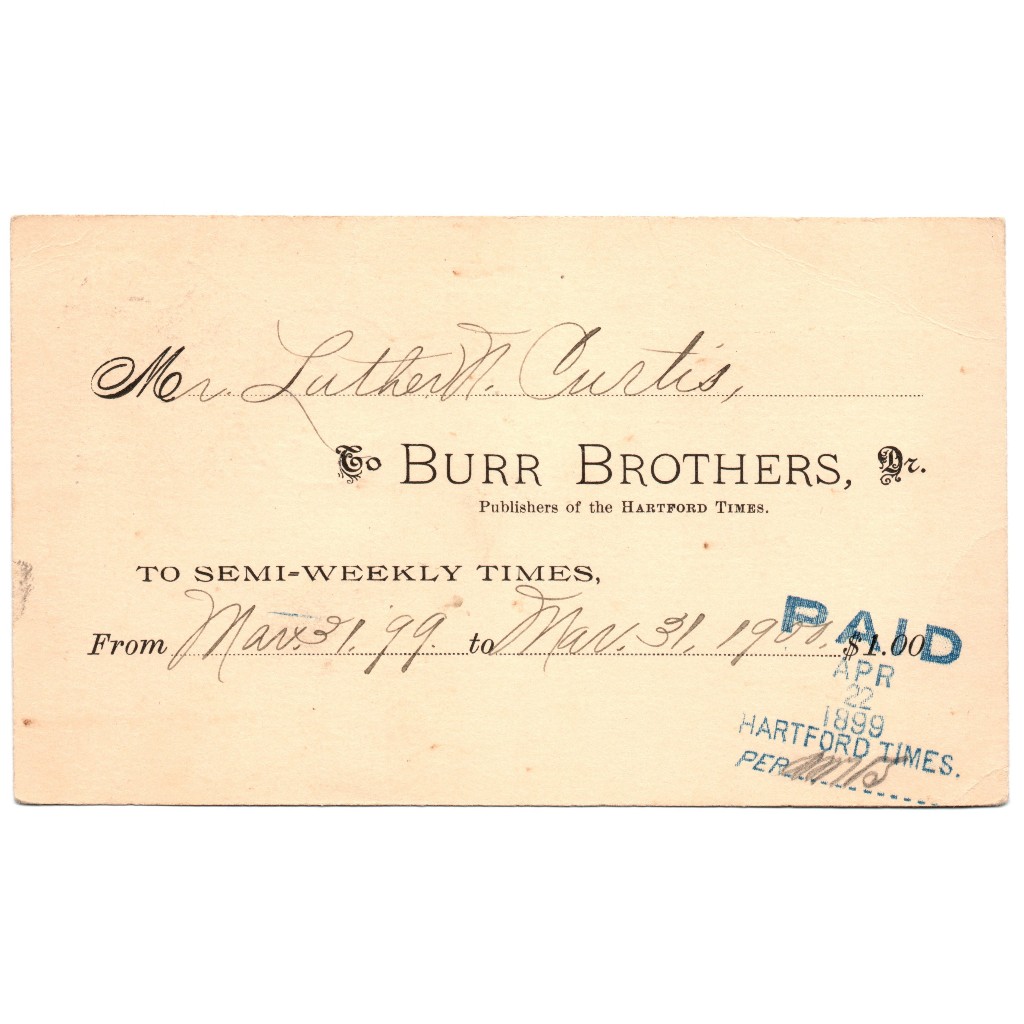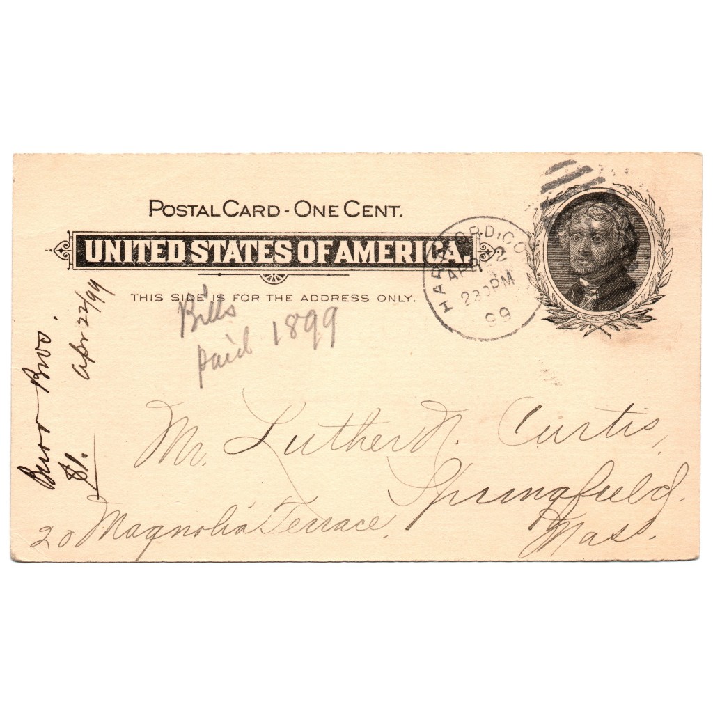 1899 Vintage Americana One Cent Postcard Bills Paid Notification Printed Postage