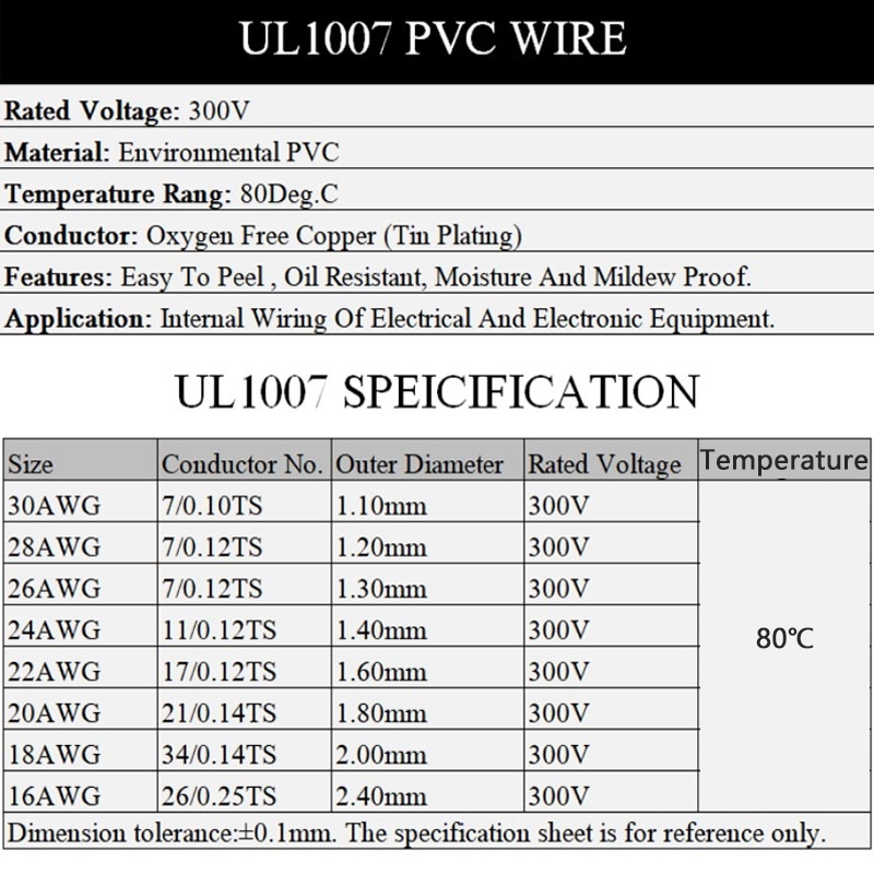 1Meters UL1007 Wire 30/28/26/24/22/20/18/16 AWG PVC Insulation Tinned Copper Electronic Cable