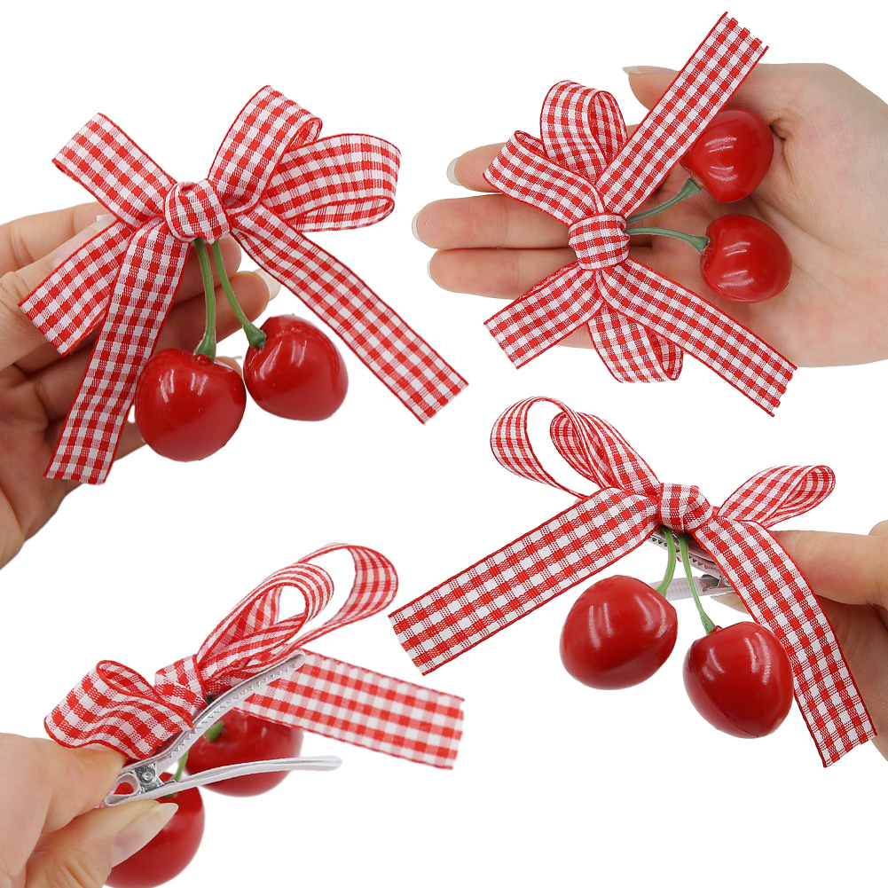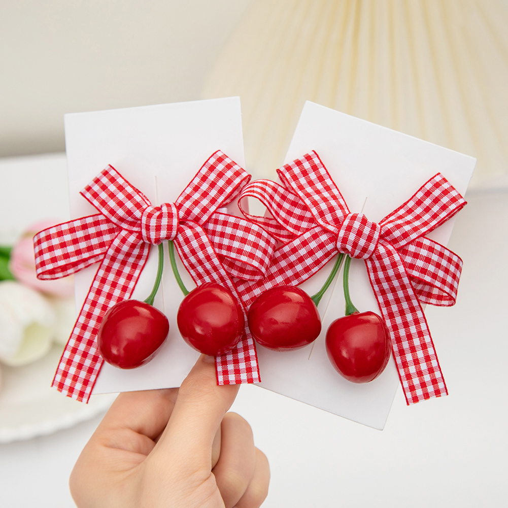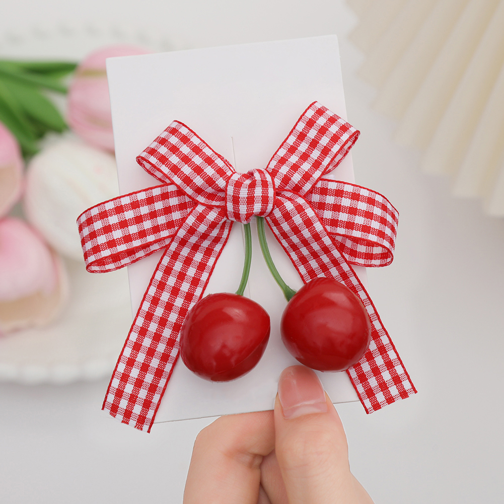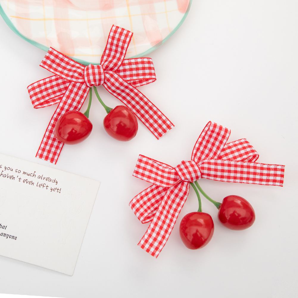 1pcs Spring Summer Girls Cherry Hair Clip Red Plaid Ribbon Dovetail Bow Pair Clip Hair Accessories Girl Fruit Headdress Baby Daily Seamless Does Not Hurt Hair Side Clip