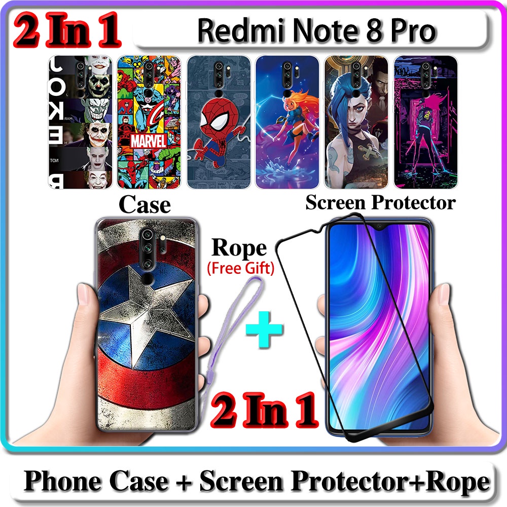 2 IN 1 Case Redmi Note 8 Pro Case with Tempered Glass Curved Ceramic Screen Protector LOL and Hero Design