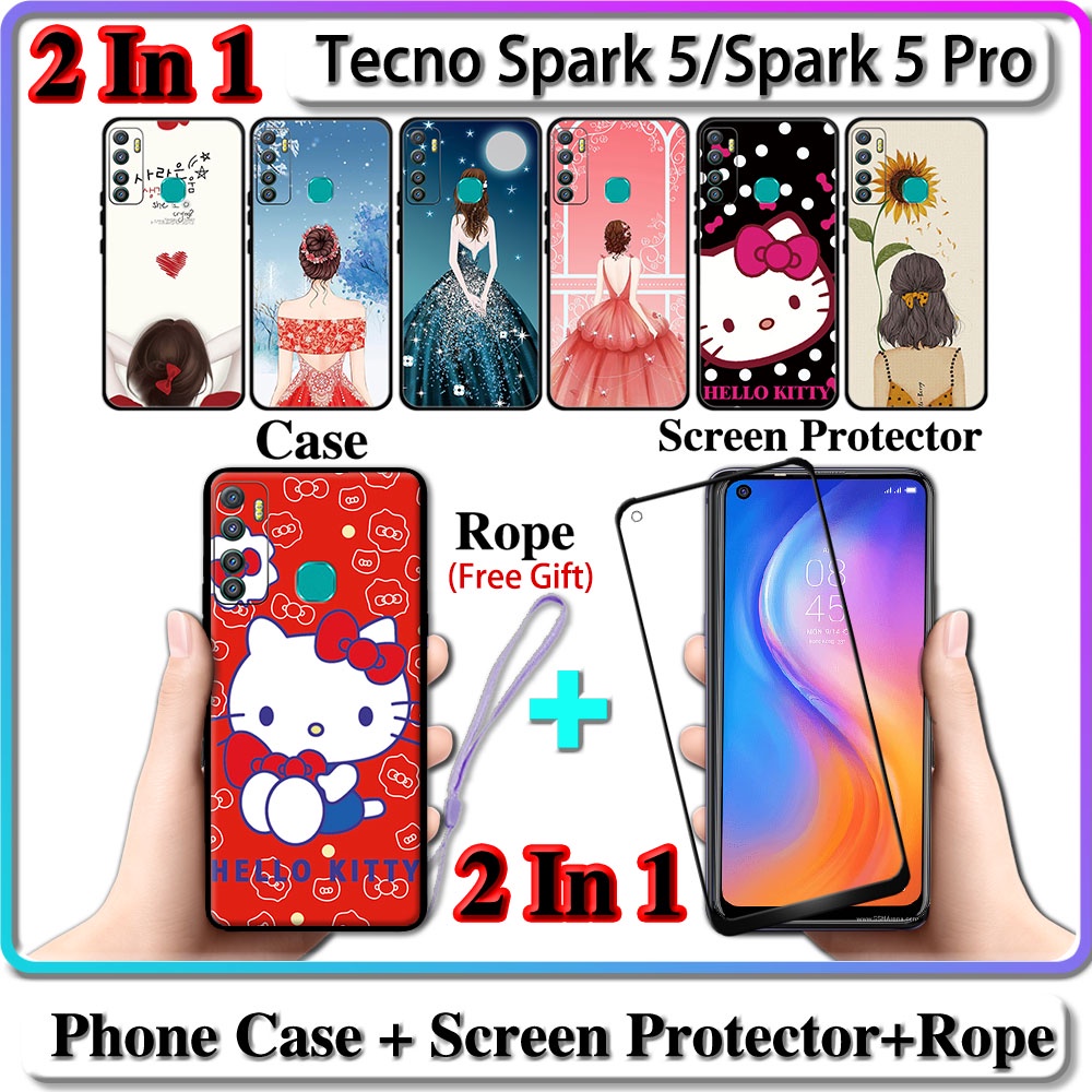 2 IN 1 Case Tecno Spark 5 Spark 5 Pro Case with Tempered Glass Curved Ceramic Screen Protector For Girl and kitty