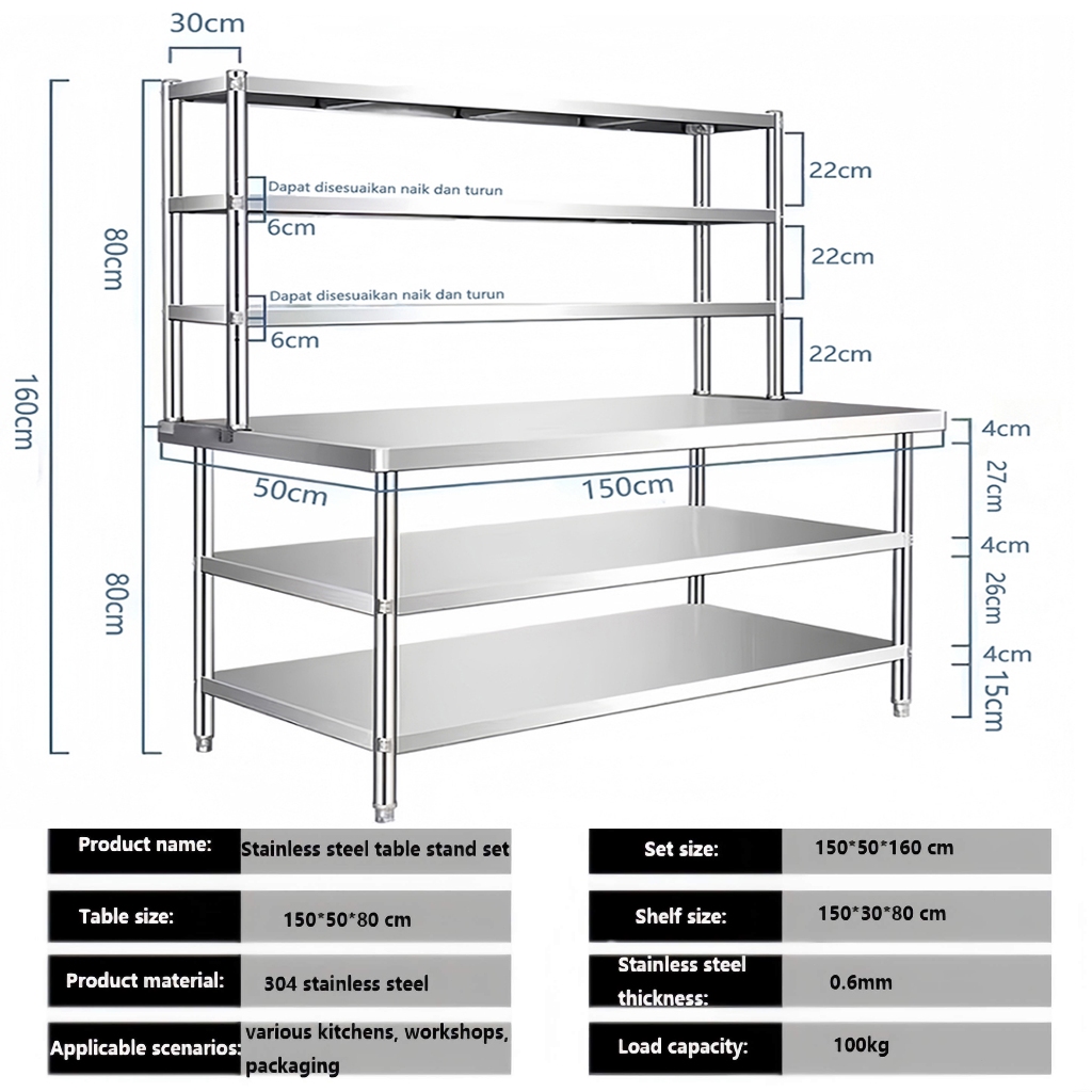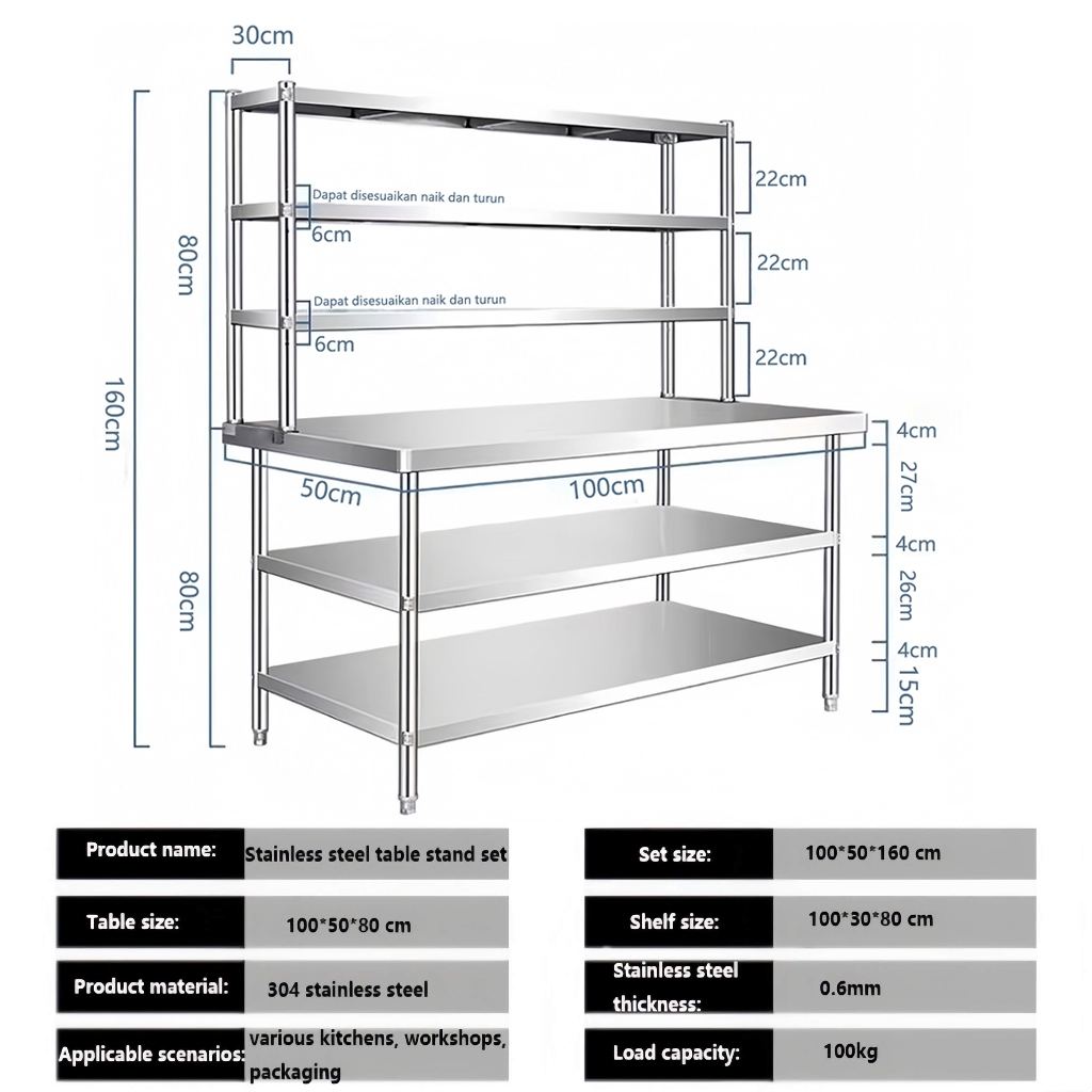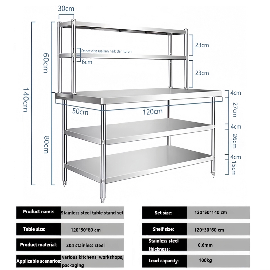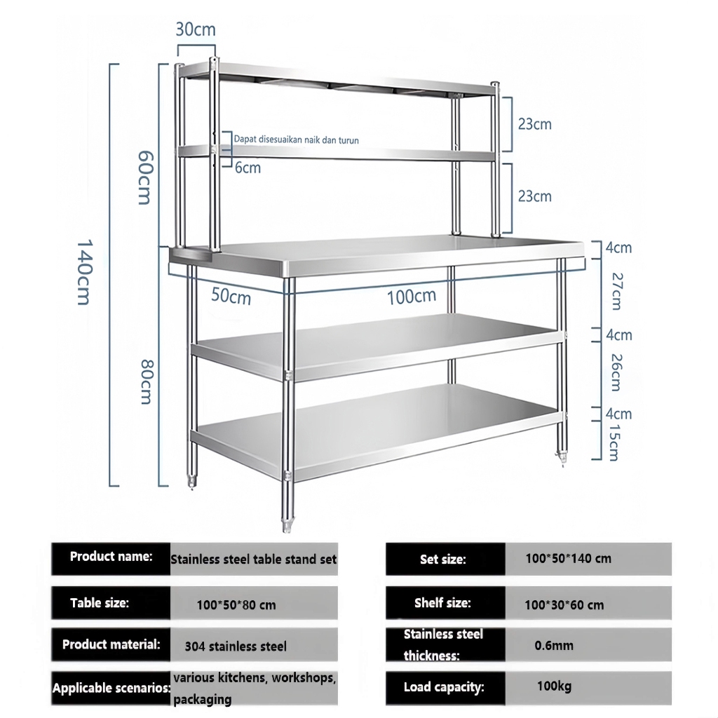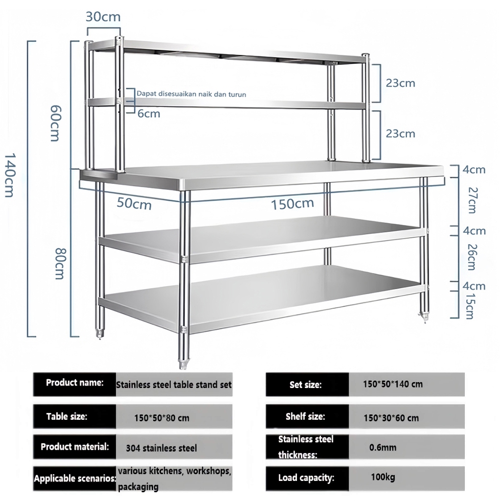 2-layer Table 304 Stainless Steel Worktable Easy to clean Thicken Storage table Operation console