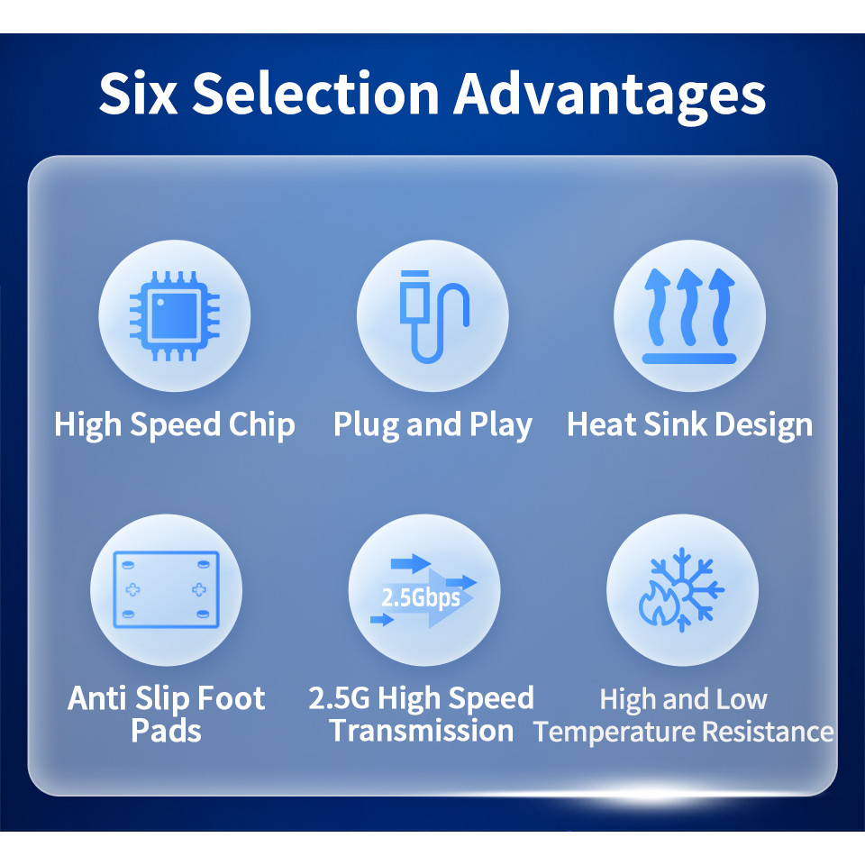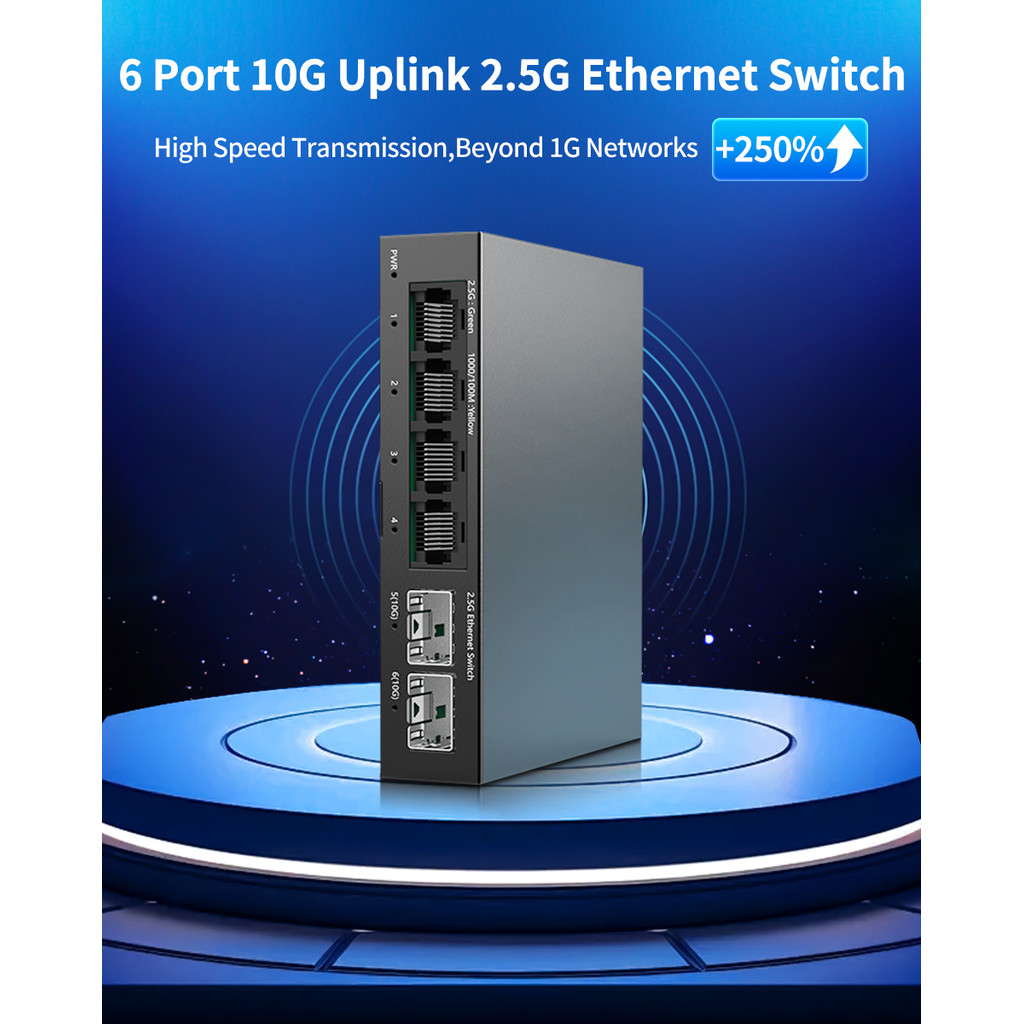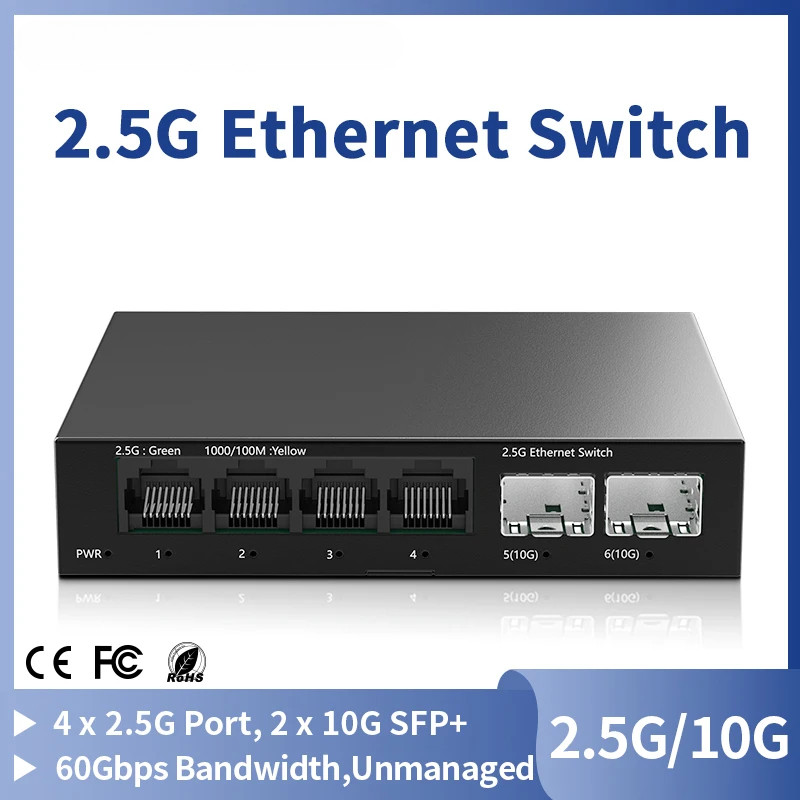 2.5GbE Switch 2.5GBASE-T 4 Port 2.5G RJ45 with 2 Port 10G SFP+ Fanless Plug and Play Network Switch Desktop Wall Mounted