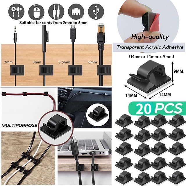 20 Pcs Self Adhesive Cable Management Clips, Cable Organizers Sticky Wire Clips Cord Holder for TV PC Laptop Ethernet Cable Desktop Home Office