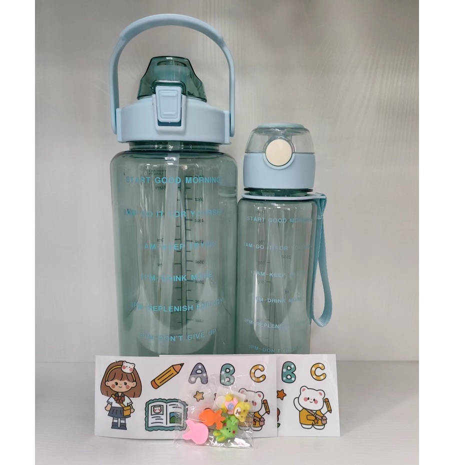 2000ML/2L + 850ml 2in1 Motivational Water Bottle W/ Time Marker Straw BPA Free Locking Flip Flop Lid