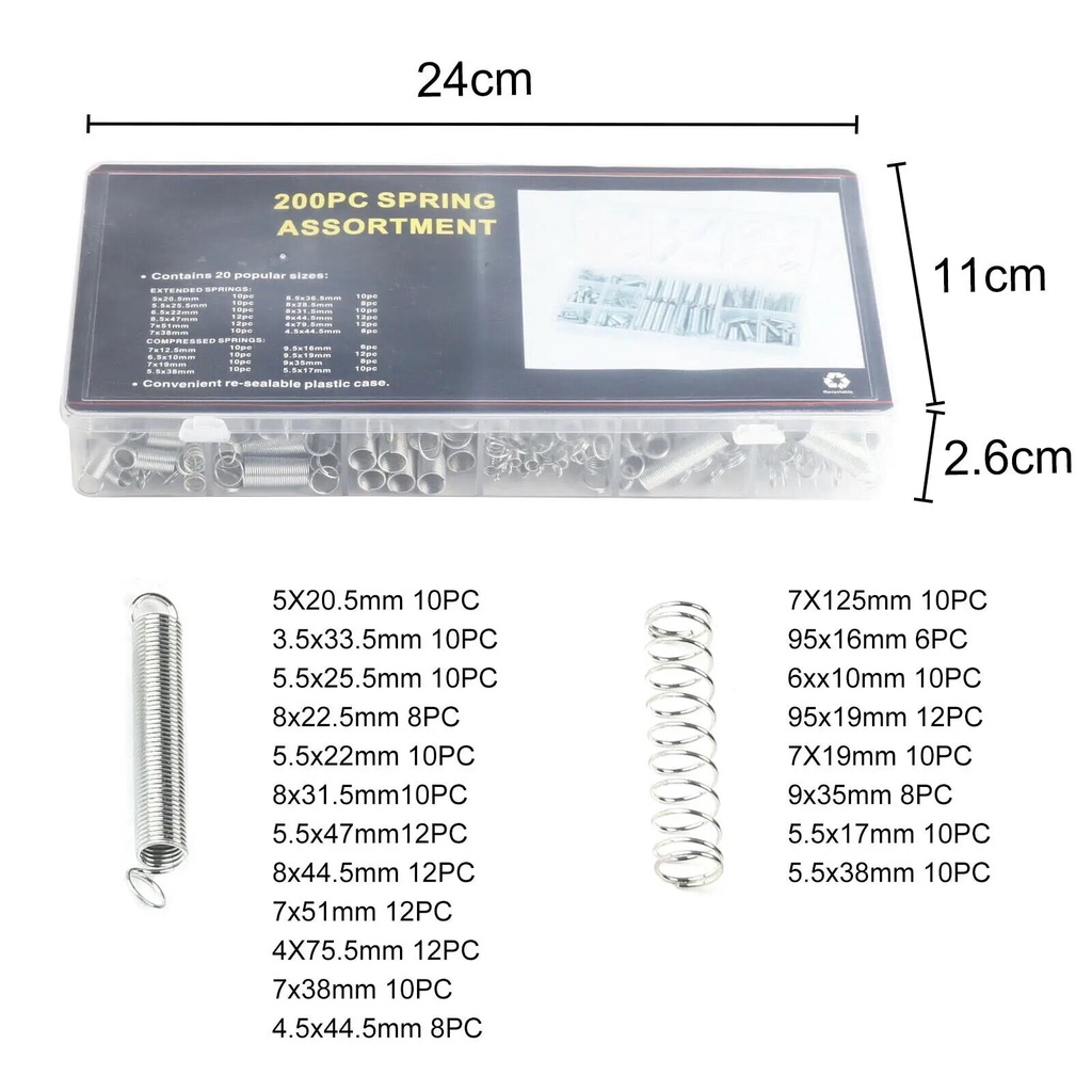 200PCS Spring Assortment Set 20 Specifications Zinc Plated Compression and Extension Springs
