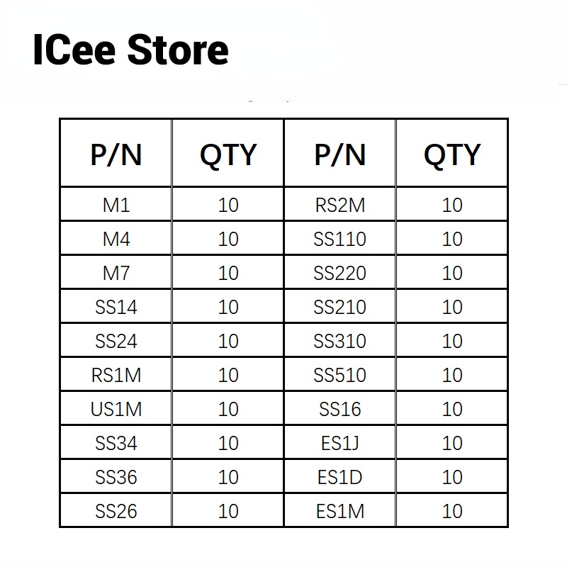 200Pcs SMD Diode Kit Assorted Kit SS110 SS220 SS210 SS310 SS510 SS16 SS26 SS34 SS36 ES1J ES1D M7 M4 US1M