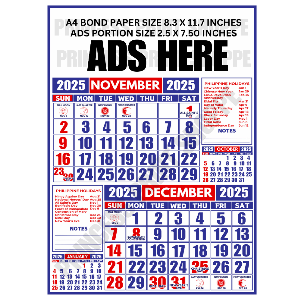 A4 Bond Paper Size 6 pages 2026 Commercial Calendar - 30/50/100 pcs