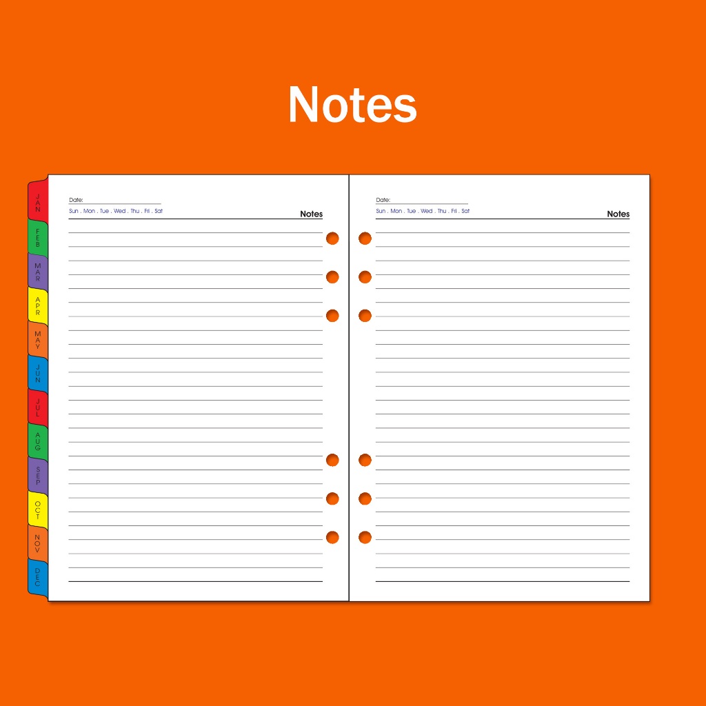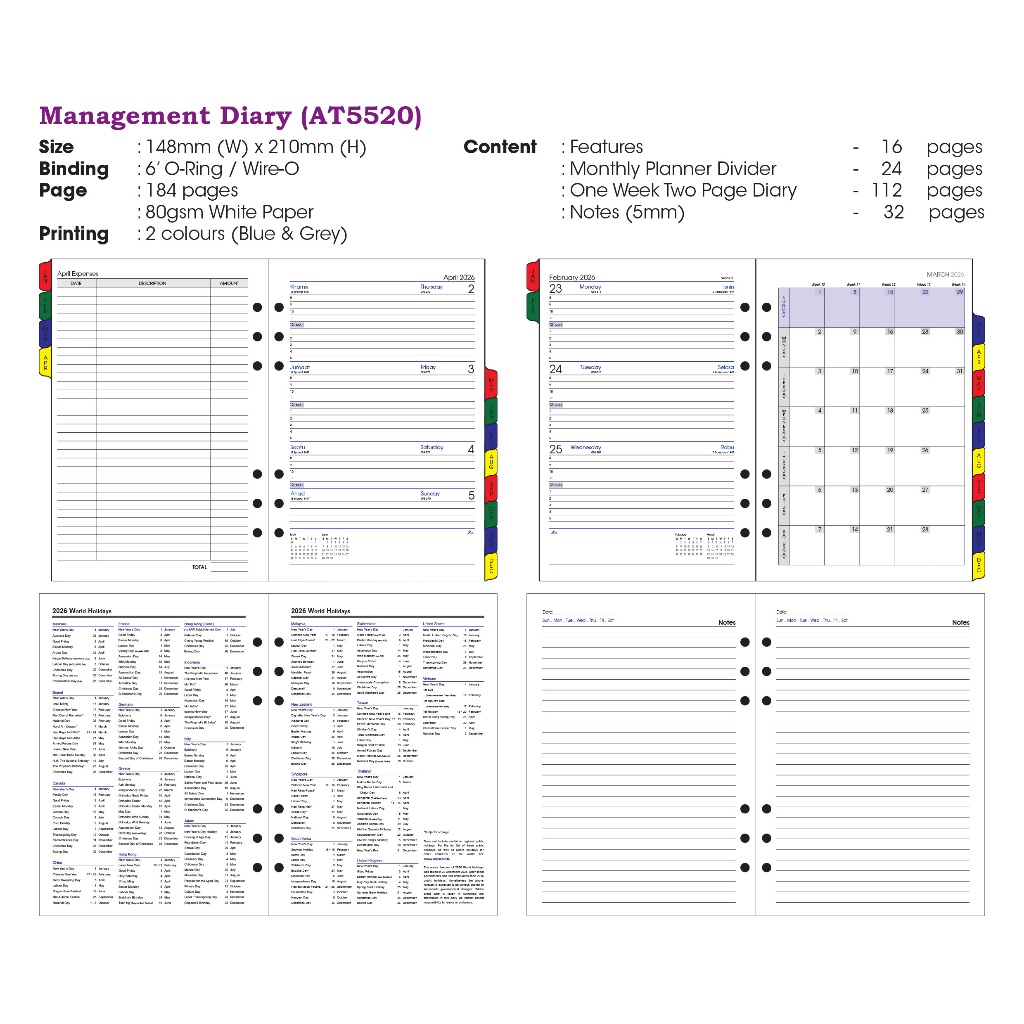 2026 Diary A5 Organizer 6 O Ring Loose Leaf Refill Management Diary Refill Week to View Planner AT5520