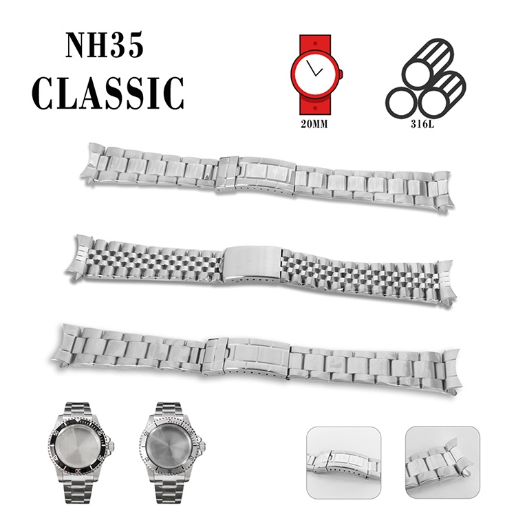 20MM Stainless Steel Watch Strap Medium Gloss/ Five-bead/Full Sand Watchband Belt for Vintage Watch Case Modification Part